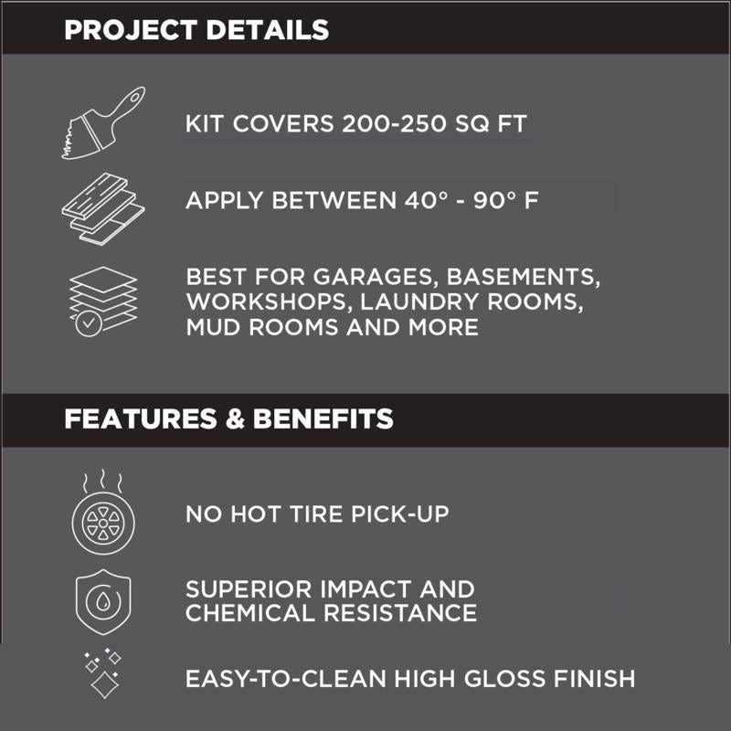 • Durable, polycuramine concrete coating works on interior concrete surfaces including garage floors, workshops, basements, family rooms and more