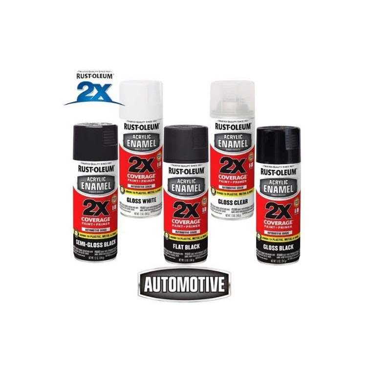 Rust-Oleum Acrylic Enamel 2X Sprays offer long lasting protection and durability with ultimate coverage for automotive, equipment and other general purpose paint projects. Acrylic Enamel 2X combines the benefits of paint and primer in one spray with twice the coverage of competitive aerosols for metal, most plastic, wood and other surfaces. Complete projects faster with high quality paint and a fast drying formula. Features any angle spray technology to spray in any direction, even upside down, with a comfort spray tip that reduces finger fatigue caused by continuous spraying. Apply 2 or more light coats a few minutes apart in a steady back-and-forth motion for best results.