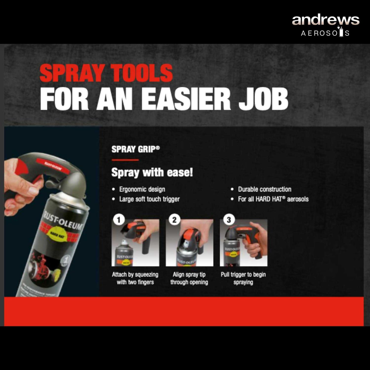 Rust-Oleum Comfort Grip for Aerosols is an ergonomic spray can attachment to provide maximum control when using aerosols to complete large projects. Best Uses Rust-Oleum High Performance Comfort Grip for Aerosols is best used for the ease of application on large areas to be spray painted. Its ergonomic design provides maximum control when using an aerosol paint, making it easy to complete large projects. Has large, soft touch trigger to reduce finger fatigue Durable construction withstands repetitive use Snaps securely onto spray cans Suitable for our range of Rust-Oleum aerosols. Application Simply attach to the required spray can until Comfort Grip snaps into place. Ensure the handle is securely attached prior to use.