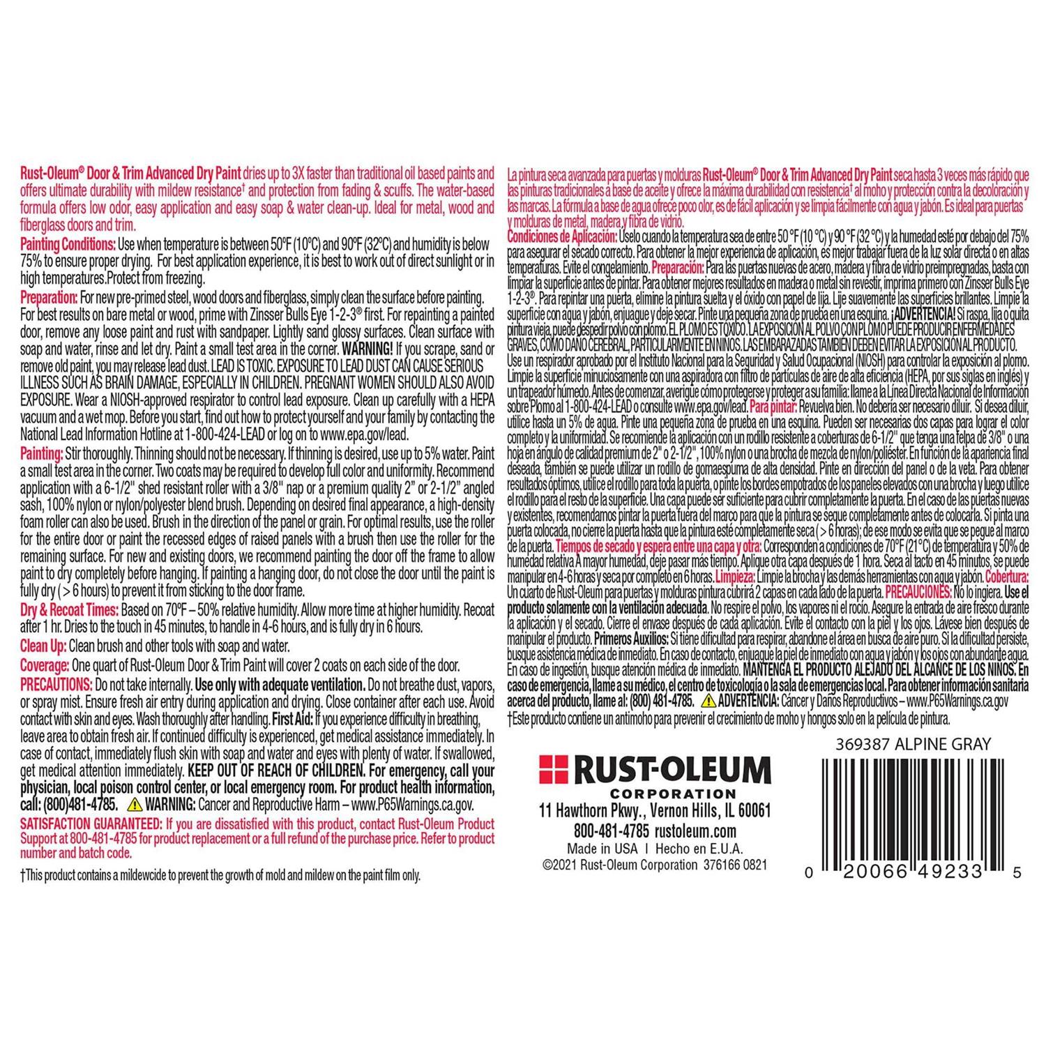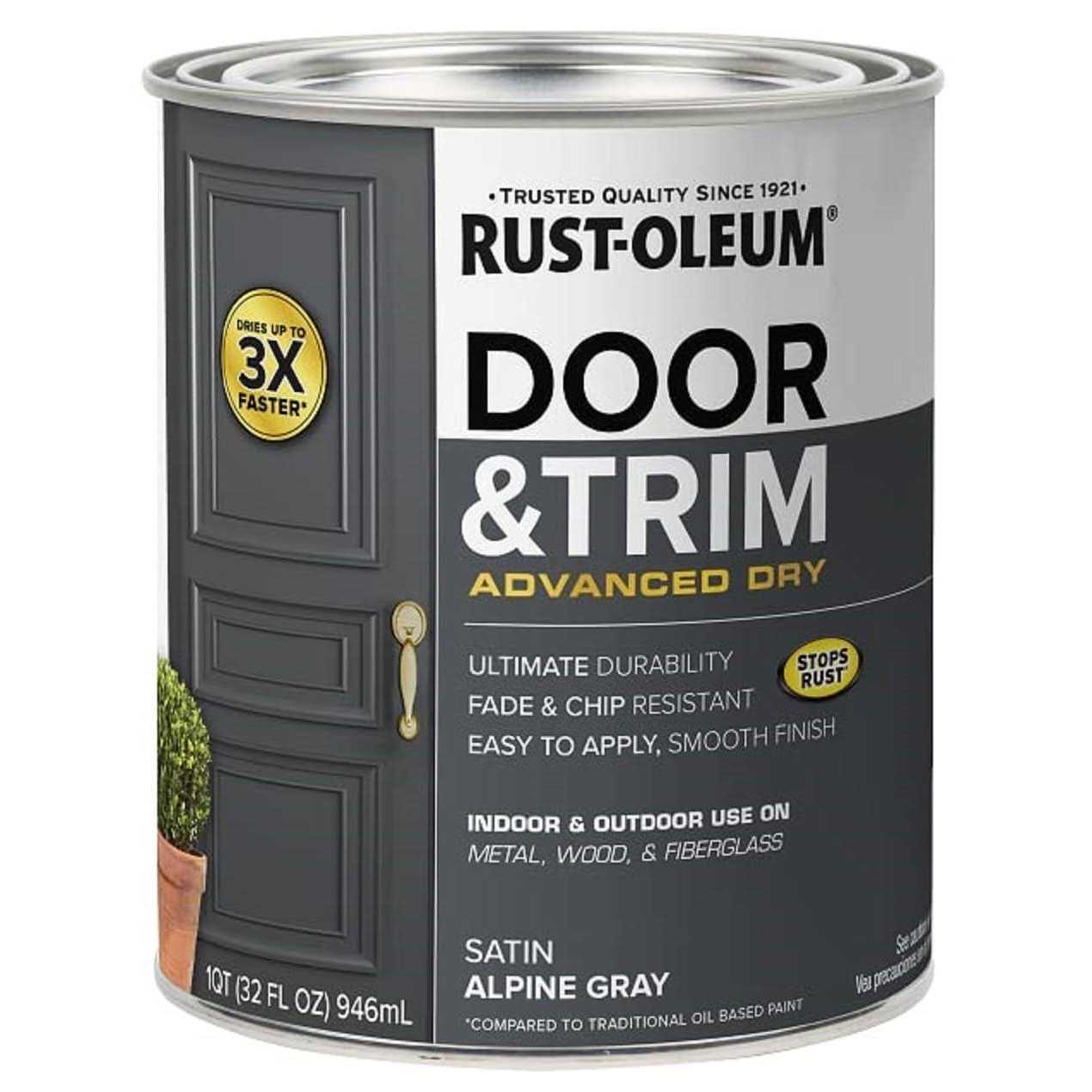 Rust-Oleum Door & Trim Advanced Dry Paint is an easy to use, water-based paint designed for indoor and outdoor use on metal, wood and fiberglass door and trim. The pre-mixed color options offer a trendy, fresh look on outdated doors with ultimate durability and a beautiful satin sheen. Rust-Oleum Door & Trim Paint dries up to 3X faster than traditional oil based paints and protect against fading and scuffs. Easy to apply door paint covers 2 coats on each side of the door.