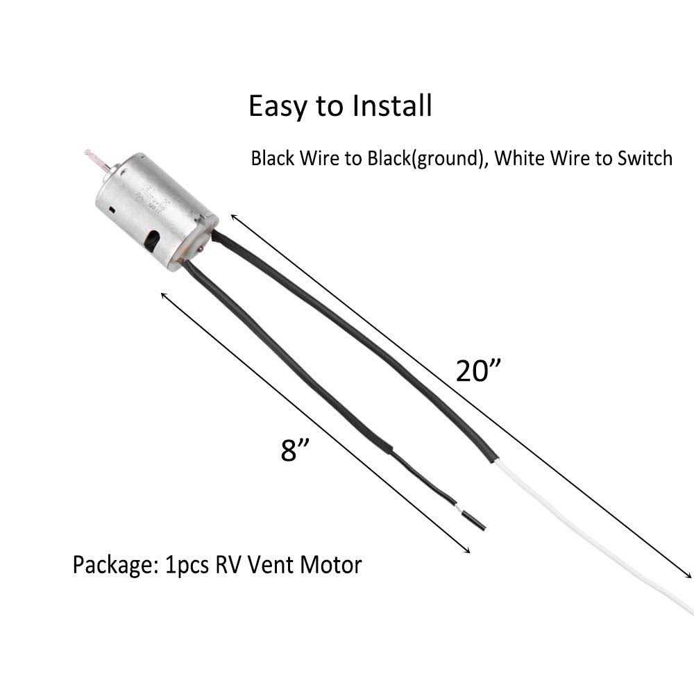 【12V Power Vent Motor】This motor is replacement motor for 12V RV roof vent fan. Brush DC motor with 0.125 APM rating, 1.5W working power; 5,000 RPM; Can be used to power an RV vent fan such as a bathroom fan or a range hood fan, good to dispel moisture or smells. 【1/8″(0.125″) D-Shaft】The fan motor body size is 2-1/5 inch length x1-2/5 inch diameter (57mmx36mm), D-shaft size is 1/8 inch x 3/5 inch(3.17mm x 16mm), 18AWG*2 terminal connect cords (White 20-inch/50.8cm with 7-1/4-inch/18.5cm black jacket; Black 8-inch/20cm with 5-1/2 inch/14cm black jacket) 【ROTATION 】This rv vent motor has reverse polarity, meaning that it can be wired to turn in either clockwise or counter-clockwise rotations; Rotation direction depends on your fan blade wiring (one wire goes to the hot side of switch, other goes to ground); To determine the direction of spin on your existing fan, look down through the motor at the top of the blade. 【Competiable Brands】This fan motor is compatible for vents like Elixir, Heng’s, Jensen, Ventline and similar 6-inch (15.2cm) fan blades. Pls check pictures and dimensions carefully before you order. 【Easy to Install】Wire your fan to the motor switch, then wire the switch to your RV; Ensure that the wires connect black to black (grounds) and the other wires connect together; Save your old fan blades – Pull on the hub (center part of blades) off the shaft and push the center hub of the blades back on the new motor shaft (Flat side on motor shaft used to align the hole in the hub and slide on); Mounting screws and fan blade not included. 【12V Power Vent Motor】The motor is replacement motor for 12V RV roof vent fan. Brush DC motor with 0.125 APM rating, 1.5W working power; 5,000 RPM; Can be used to power an RV vent fan such as a bathroom fan or a range hood fan, good to dispel moisture or smells. 【1/8″(0.125″) D-Shaft】The motor body size is 2-1/5 inch length x1-2/5 inch diameter (57mmx36mm), D-shaft size is 1/8 inch x 3/5 inch(3.17mm x 16mm), 18AWG*2 terminal connect cords (White 20-inch/50.8cm with 7-1/4-inch/18.5cm black jacket; Black 8-inch/20cm with 5-1/2 inch/14cm black jacket) 【ROTATION 】This power vent motor has reverse polarity, meaning that it can be wired to turn in either clockwise or counter-clockwise rotations; Rotation direction depends on your fan blade wiring (one wire goes to the hot side of switch, other goes to ground); To determine the direction of spin on your existing fan, look down through the motor at the top of the blade. 【Competiable Brands】This fan motor is competiable for vents like Elixir, Heng’s, Jensen, Ventline and similar 6-inch (15.2cm) fan blades. Pls check pictures and dimensions carefully before you order. 【Easy to Install】Wire your fan to the motor switch, then wire the switch to your RV; Ensure that the wires connect black to black (grounds) and the other wires connect together; Save your old fan blades – Pull on the hub (center part of blades) off the shaft and push the center hub of the blades back on the new motor shaft (Flat side on motor shaft used to align the hole in the hub and slide on); Mounting screws and fan blade not included.