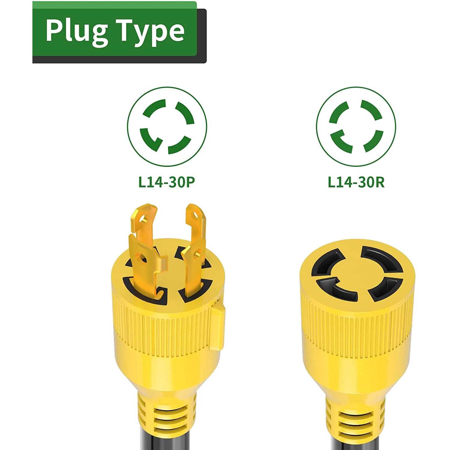 - Quality Cable – NEMA L14-30P to L14-30R SJTW 10 Gauge 4 Prong 10FT generator extension cord 125/250V.