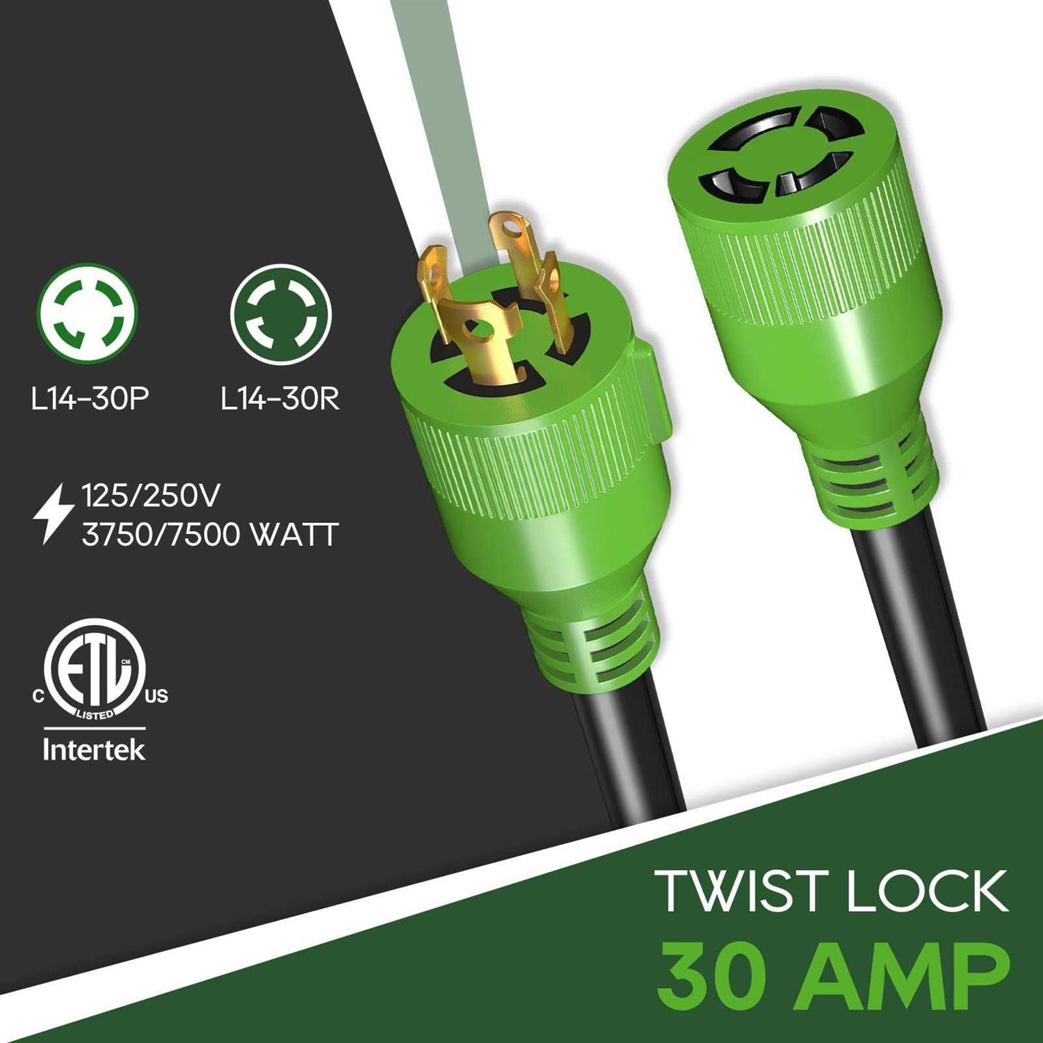 - Quality Cable – NEMA L14-30P to L14-30R SJTW 10 Gauge 4 Prong 75FT generator extension cord 125/250V.