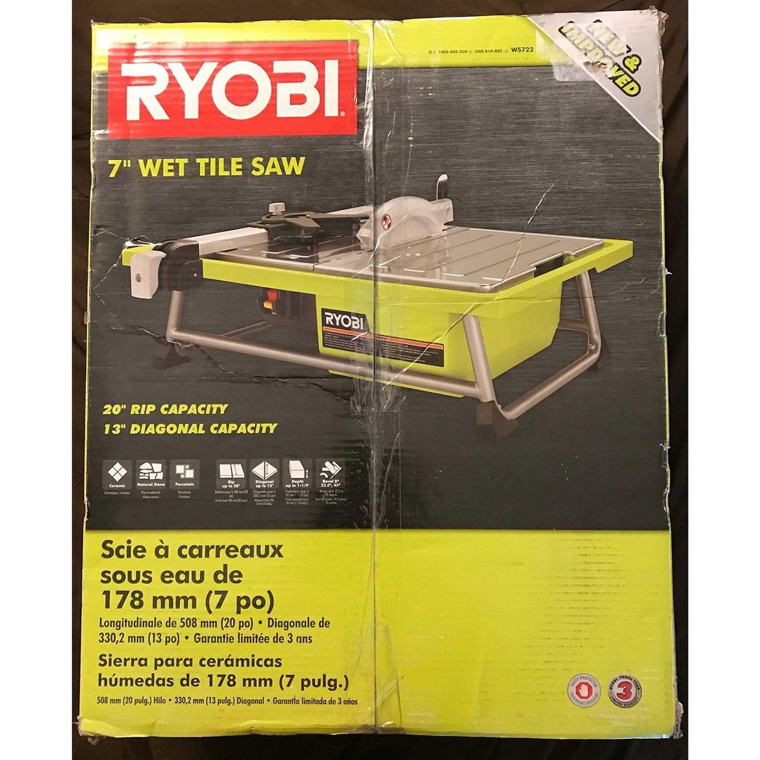 RYOBIintroducesthe7in. 4.8AmpTileSawwithStand. Thissawalsofeaturesbestinclasscuttingcapacitywiththeabilitytorip20in. tileanddiagonallycut13in. Thetilesawcutsthroughceramic, porcelainandstonetilesupto1-1/4in.