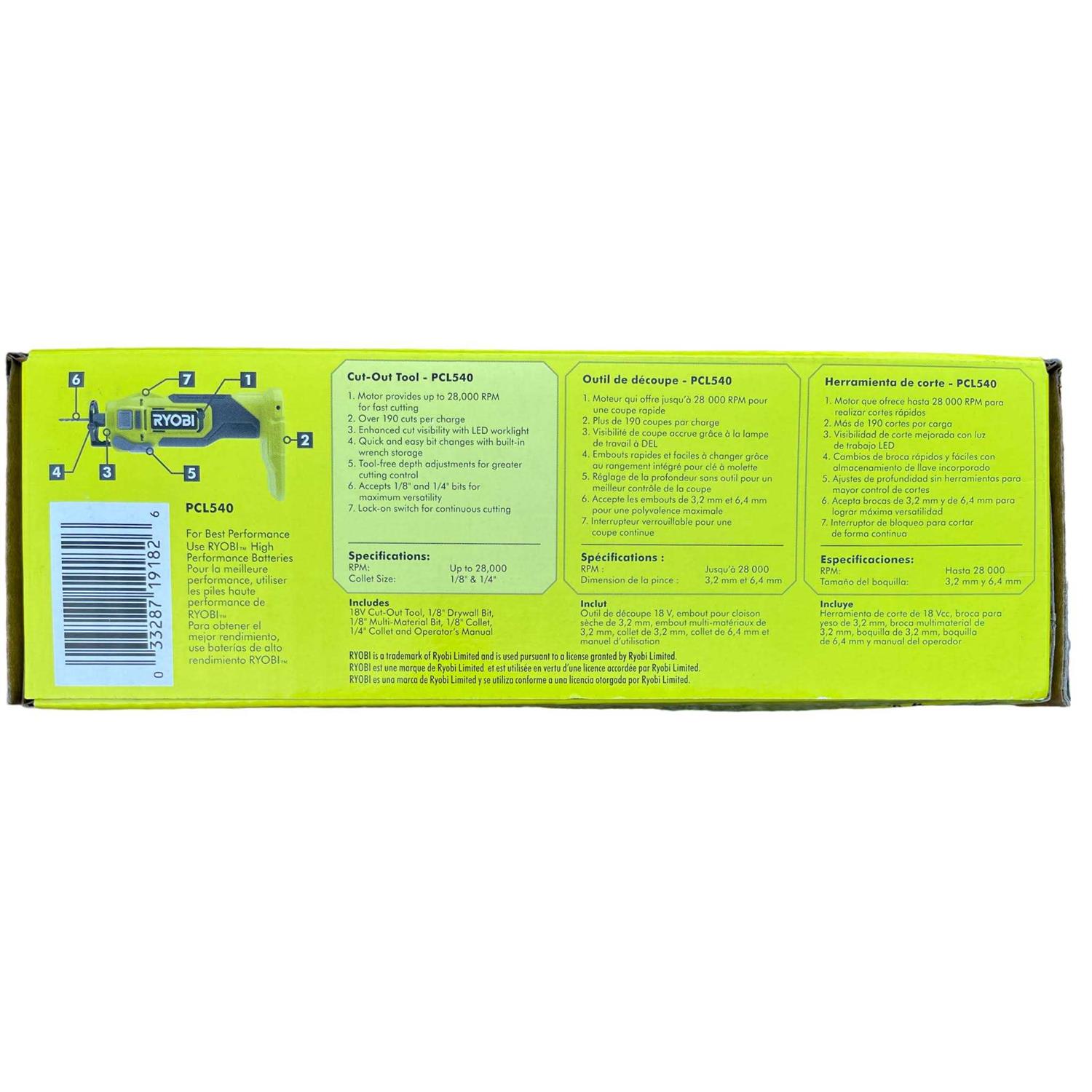 RYOBI ONE+ 18V Cordless Cut-Out Tool The powerful motor provides up to 28,000 RPM while also delivering over 190 cuts per charge. Equipped with an on-board LED worklight you will experience enhanced cut visibility. This tool accepts 1/8 in. and 1/4 in. bits while also incorporating quick and easy bit changes with built-in wrench storage. Age Group: adult.