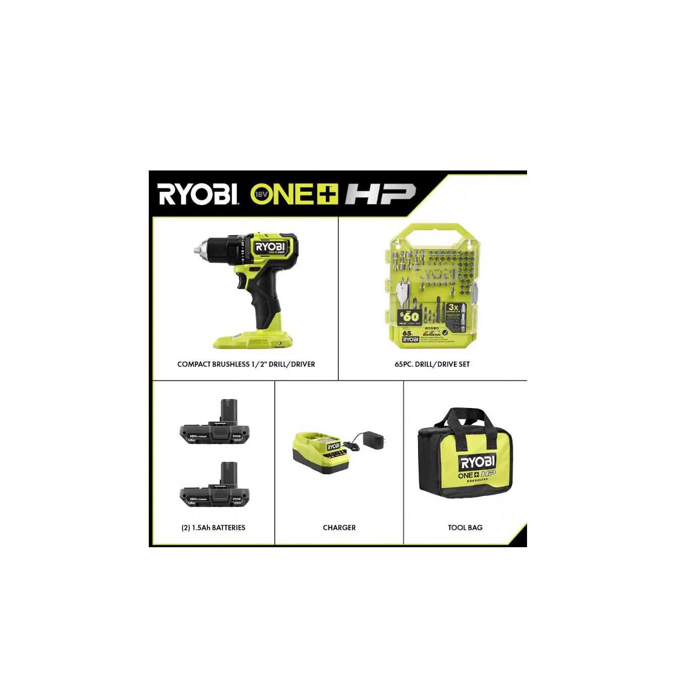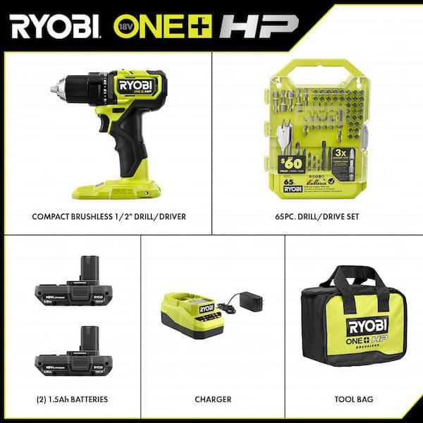 Ryobi PSBDD01K-A986501 One+ HP 18V Brushless Cordless Compact 1/2 in. Drill/Driver Kit with (2) 1.5 Ah Batteries, Charger, Bag, & 65pc Bit Set