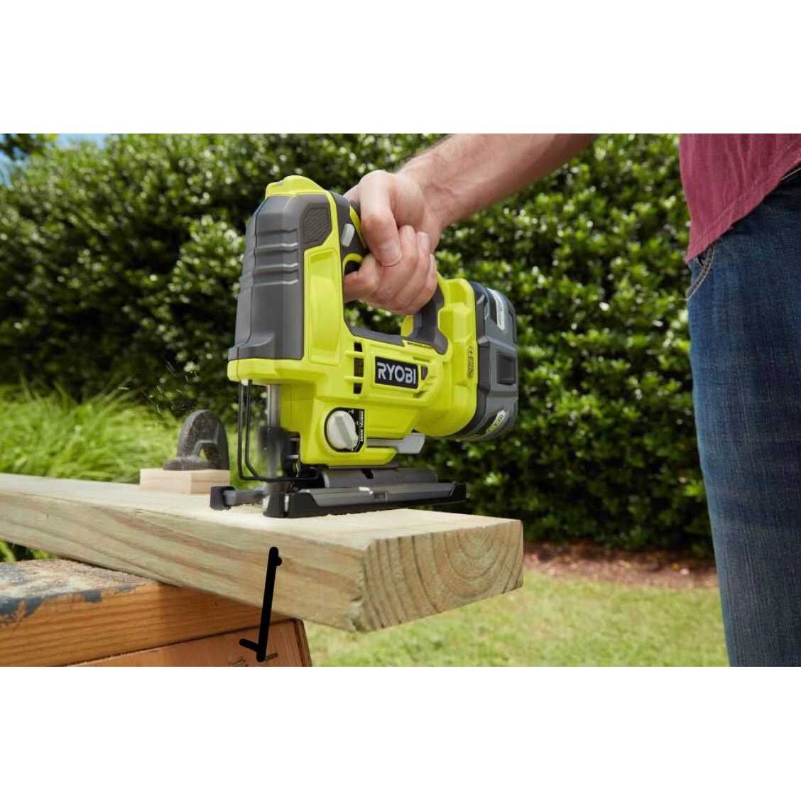 Jig Saws by RYOBI. Details:he RYOBI 18V ONE+ HP Brushless line of products is redefining power and performance. The 18V ONE+ HP Brushless Jig Saw features a brushless motor, which delivers 36% faster cutting and 78% longer runtime, ensuring you are able to cut through projects faster than ever. The variable speed dial and four orbital settings deliver maximum versatility and ultimate control when tackling any job. Lock on the trigger for additional control for detailed cutting and use the tool-free bevel adjustment to ensure accurate cuts. Change your blades out quickly with the easy release blade lever to save time on the job. Best of all, it is part of the RYOBI ONE+ System of over 225 Cordless Tools that all work on the same battery platform. Battery and charger sold separately. Brushless motor provides up to 36 percent faster cutting and up to 78 percent longer runtime Easy release blade lever for quick blade changes 4 orbital settings for increased cutting versatility Tool-free bevel adjustment for easy bevel changes, with locking detent at 45 degree left and right On-board LED worklight illuminates workspace for clear cut line visibility Voltage: 18.0 volts Power source type: Battery Powered