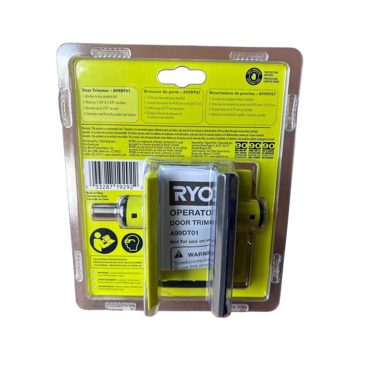 The RYOBI Wood Door Trimmer is the perfect solution for frustrating sticking doors. This unique trimmer requires only a standard drill, no additional materials, to shave off excess material along your door. Removing up to 1/32 in. per pass on 1-3/4 in. & 1-3/8 in. size doors, this trimmer is the best solution for most wooden sticking doors. This fast, easy solution prevents the need to pull out bulky sanders or planers. Best of all, your wood door can stay on-hinge, cutting your project time and effort in half. Quick and easy solution for sticking doors Door removal not necessary with this tool Attaches to any standard drill for convenient use Quick and easy solution for sticking doors Door removal not necessary with this tool Attaches to any standard drill for convenient use Works on 1-3/4 in. & 1-3/8 in. size doors Removes up to 1/32 in. per pass No need for bulky sanders and planers Complete all your hardest jobs easily with the help of this astonishing RYOBI Door Trimming Drill Planer Accessory. Attaches to any standard drill.