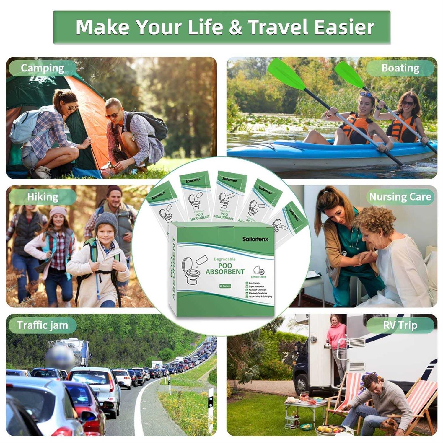 Hygiene & Sanitation by Sailortenx. Details:Sailortenx Poo Absorbent is a powder that helps you better handle human waste. It converts liquids into gels in a short time, thus effectively reducing the spillage and splashing of human waste. Our poo absorbent powder is toxic-free and environmentally safe, which makes the disposal of human waste much easier. Sailortenx Poo Absorbent provides a more efficient and hygienic solution for the disposal of human waste. Wherever you need to deal with human waste, you can use it. You may use it in scenarios such as outdoor activities, long-distance travel, home home healthcare, construction work, emergencies, etc. It can be used with our portable toilets and toilet bags. Perfect for camping, hunting, hiking, boating, long-road trip, nursing care, etc.