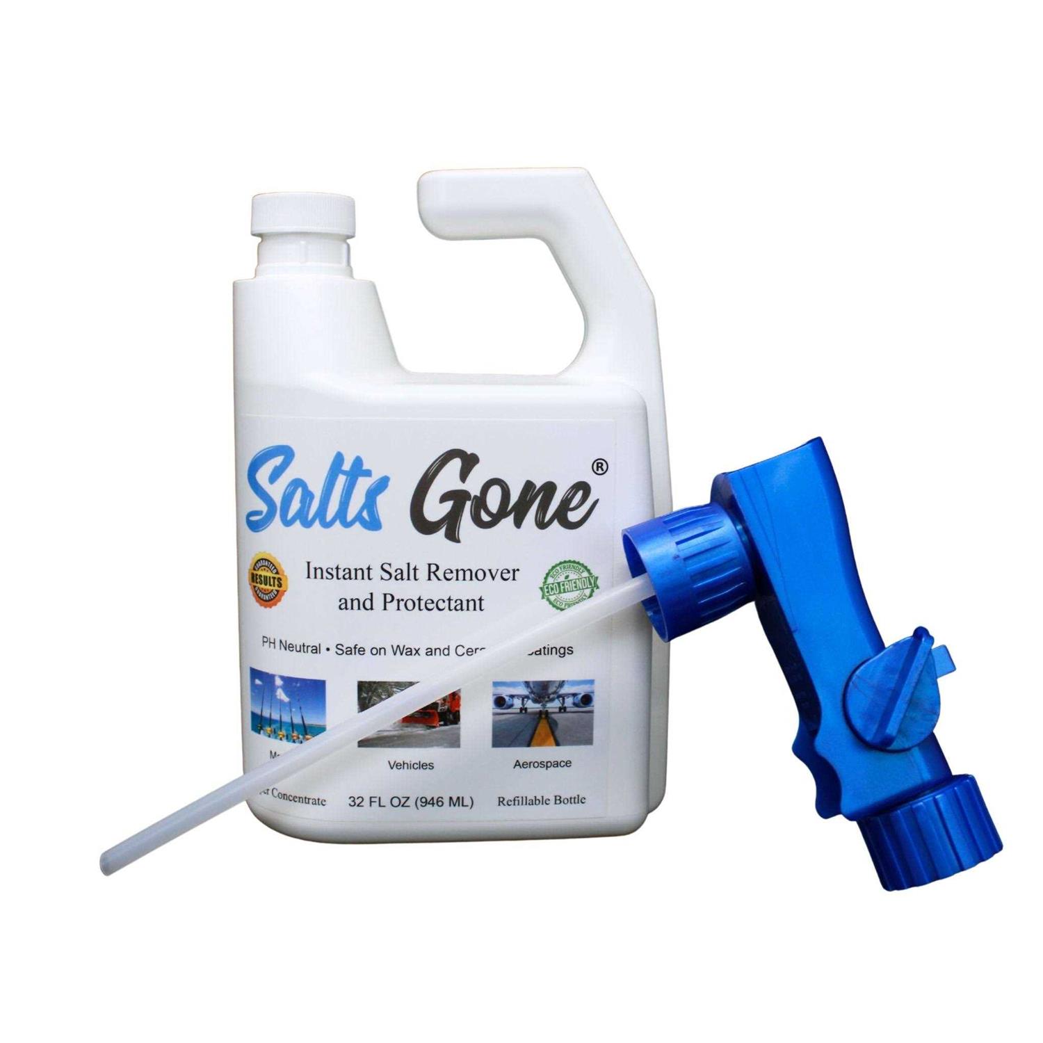 The fastest, safest, easiest solution to eliminate corrosion from salt 100% Biodegradable Safe on wax and ceramic coatings PH neutral Made in the USA Salts Gone is an instantly acting salt and brine remover for vehicles, boats and other industrial applications. Prevent salt and brine from costing you thousands in damage and depreciation. This unique chemical removes salt and brine, leaving behind a protective barrier to stop the new salt from attacking the surface. Salts Gone is a commercial grade product that is easy for any consumer to use. Simply spray on and rinse off. The super concentrated formula is designed for winter use by having an extremely low rate of water consumption. The average vehicle costs less than $1.50 to rinse! Hook up a standard garden hose and start rinsing with Salts Gone. The 32 oz. bottle comes full of concentrate and ready to use. The gallon bottle can be used as a refill for the hose end sprayer, pump sprayer, or other applicator of your choice.