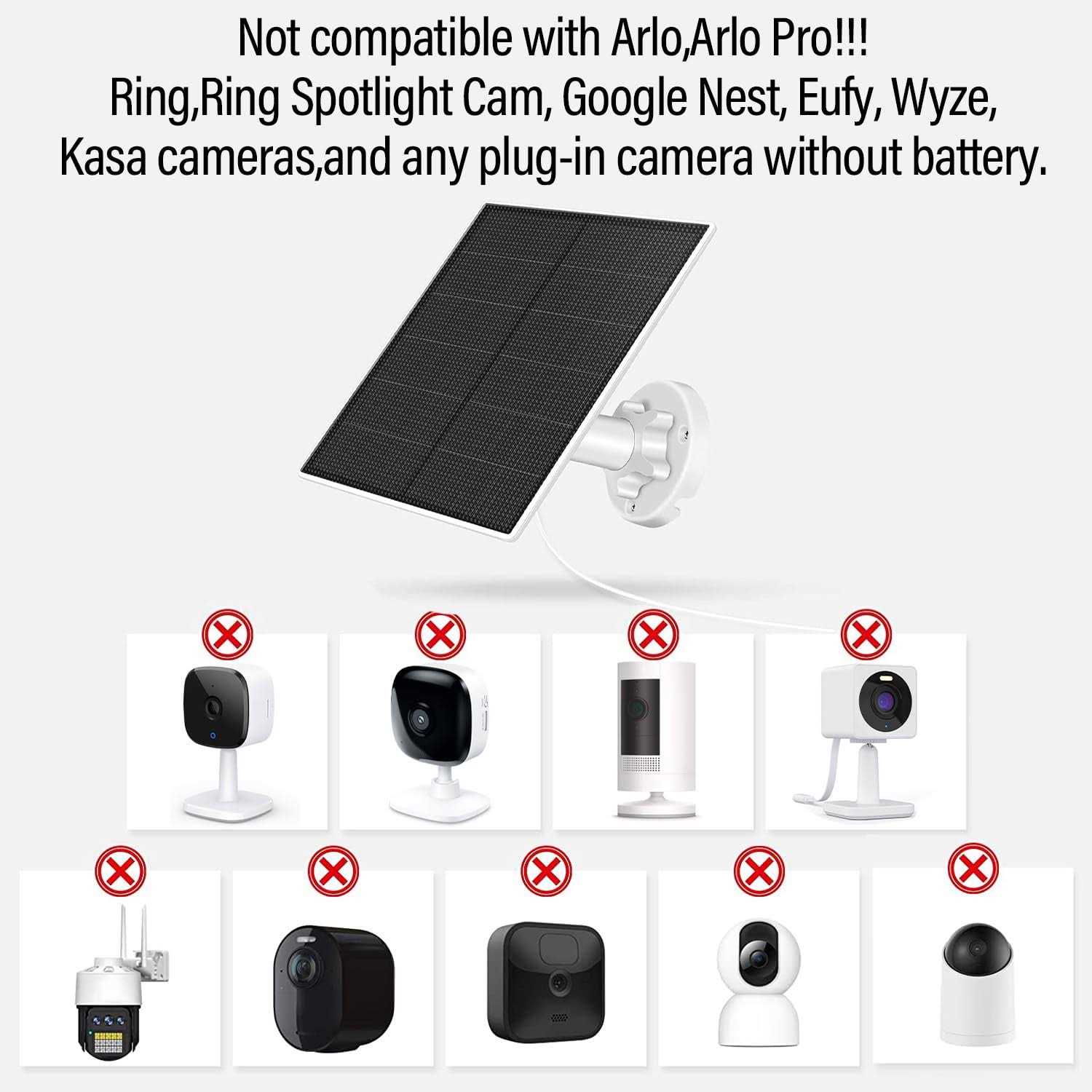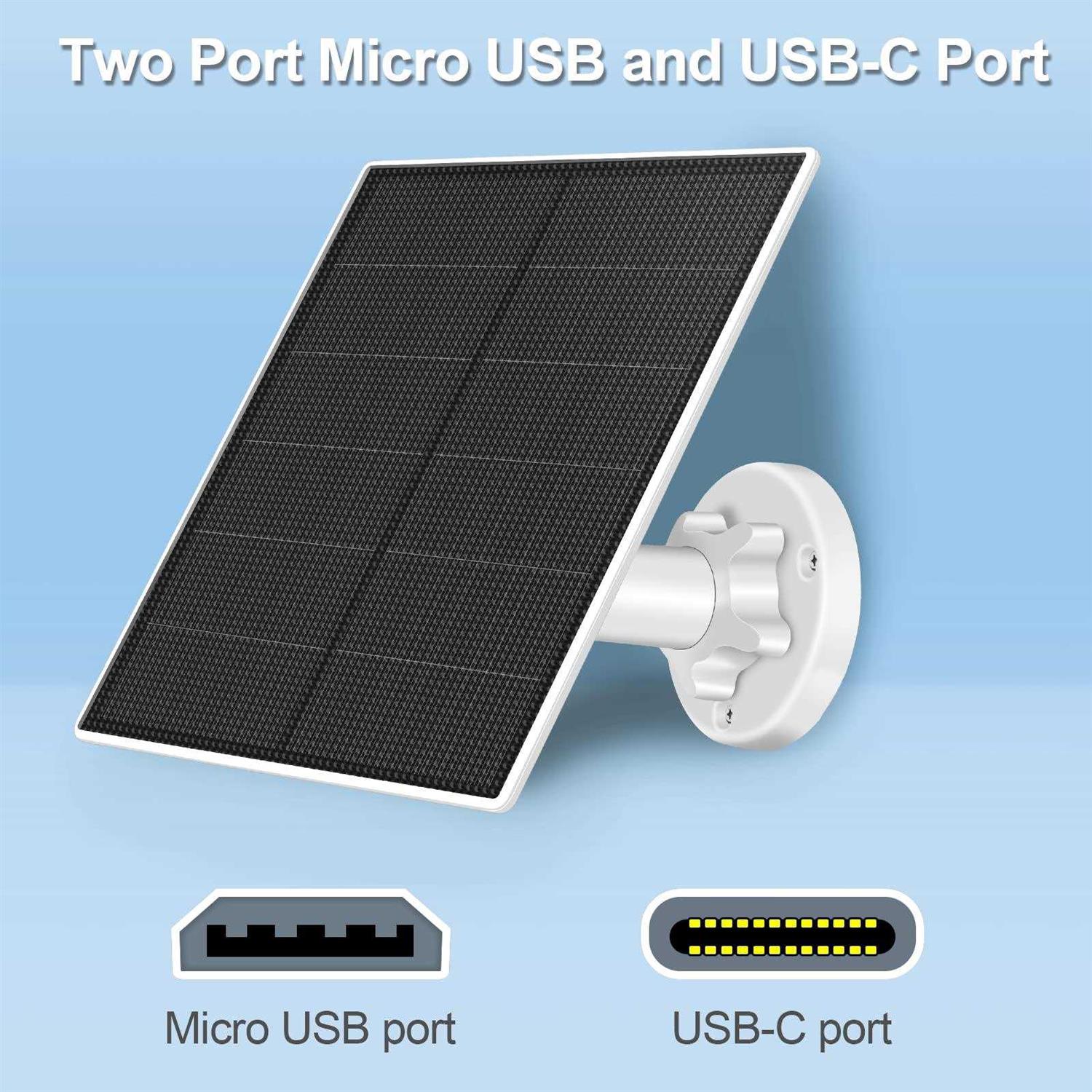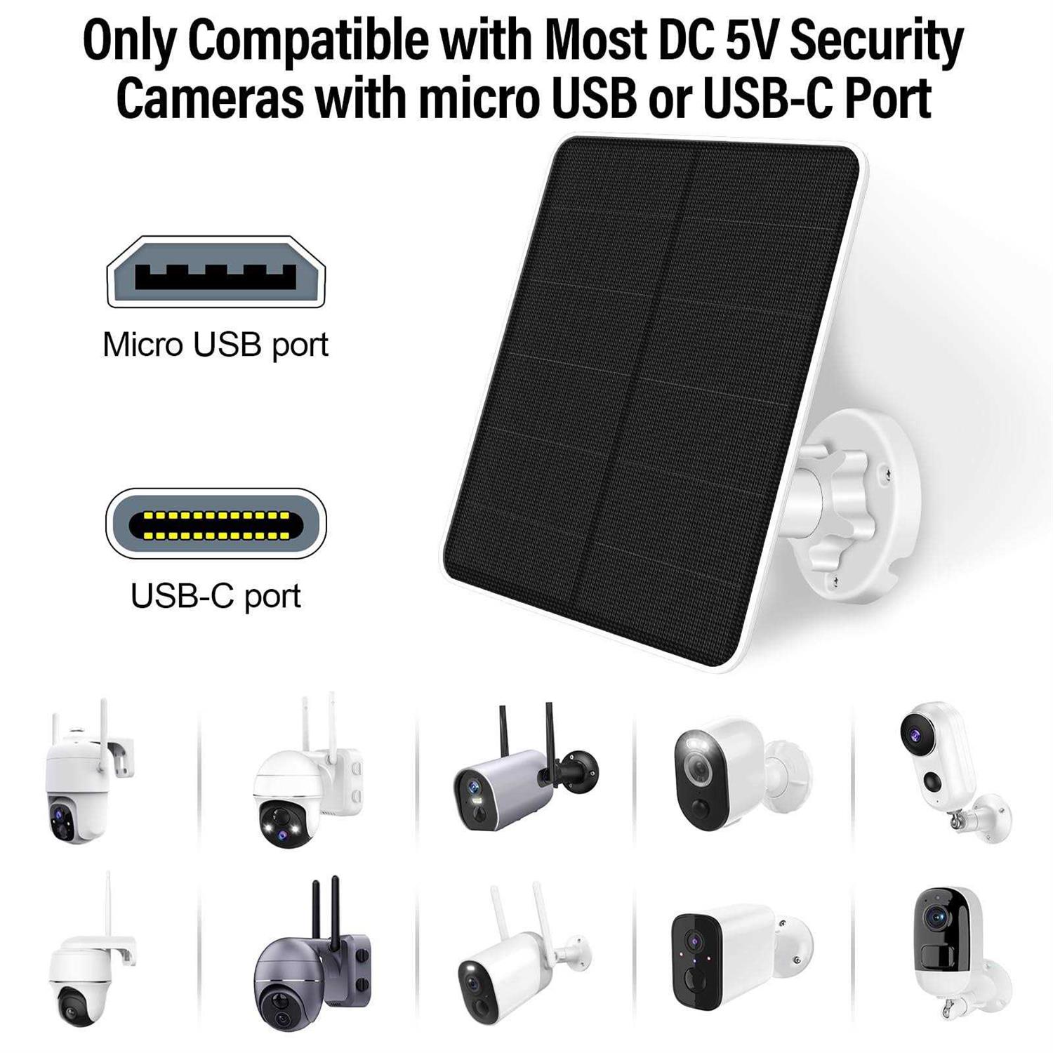 Compatible with All Micro USB & USB -C Port Camera: The 6 watt solar panel compatible with Micro USB & USB -C Port Camera, DO NOT compatible with Ring,Arlo Blink Camera. 1.5x Higher Conversion Efficiency: The solar panel is made of monocrystalline silicon,which can improve the conversion rate of solar energy, produces up to 1.5x the power of the other common Solar Panel. Nonstop Solar Power Supply: This solar panel provides nonstop power with a few hours of sunlight every day, keep the surveillance camera powered. Resist All Weather: The solar panel camera with a weather-resistant design, Goes anywhere outside and resist all weather including rain, snow, thunderstorm. Ideal Setting: This solar panel for battery camera come with 9.84 ft power cord and a 360 adjustable mounting bracket to find your ideal setting. (Recommends at least 1-2 hours of direct sunlight, depending on your usage. Ability to recharge varies based on device settings, motion notifications and sun exposure in the area of placement.)