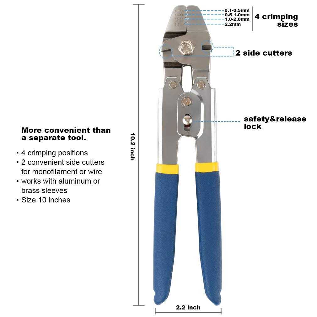 WIDE APPLICATION4 Crimping Positions: 0.1-0.5mm, 0.5-1.0mm, 1.0-2.0mm, 2.2mm. It can easily crimp copper / aluminum sleeve and more from 50-450 lb test line.Crimping tool coordinate with barrel ferrule can be widely used for wire rope, cable line dog leashes and etc CONVENIENT The 2 hardened steel side cutters work with the spring which loaded handle. It helps you cut the wire without frays and the strong spring open the cutters instead by your hands.More convenient than a separate tool. COMFORTABLECushioned non-slip grips and Feature a Safety lock: The stainless grips wrapped with the non-slip cushioned and comes with a safety lanyard. The safety lock is easy way to keep your crimper closed. 4Sizes160Pcs Barrel Ferrule and 10Pcs Steel Thimble Kit: 4size of M1 ,M1.2, M1.5, M2, total 160pcs crimping loop sleeve in a clear box, Made of high quality aluminum, anti-corrosion and durable.10pcs M2 steel thimble,meet your different needs and easy to use, without effort, just lock both ends of the guide wire by vise, pliers or compression tools. They are great to work on assorted sizes stainless steel cable array for deck railing. International products have separate terms, are sold from abroad and may differ from local products, including fit, age ratings, and language of product, labeling or instructions.