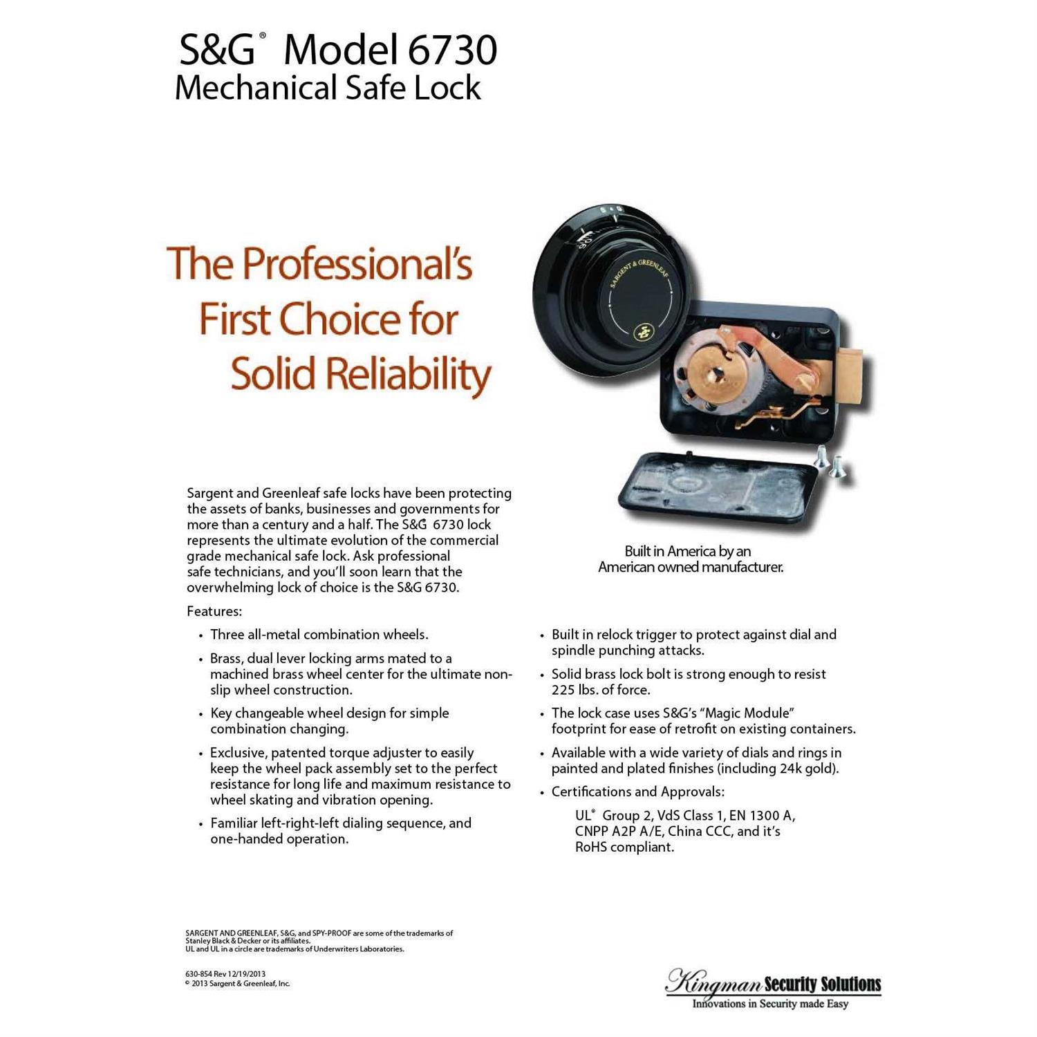Three combination wheels for 1,000,000 possible combinations. ;Integral relock trigger thwarts punch attacks. ;UL Listed Group 2 lock. Matches the mounting dimensions of most mechanical and electronic safe locks;Patented S&G torque adjuster enhances security by maintaining proper wheel pack tension. ;Brass lever with metal wheels (brass and aluminum) for long, dependable life.