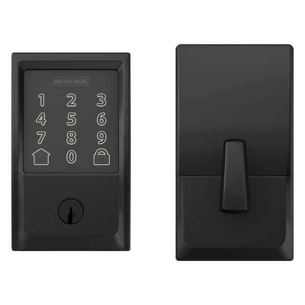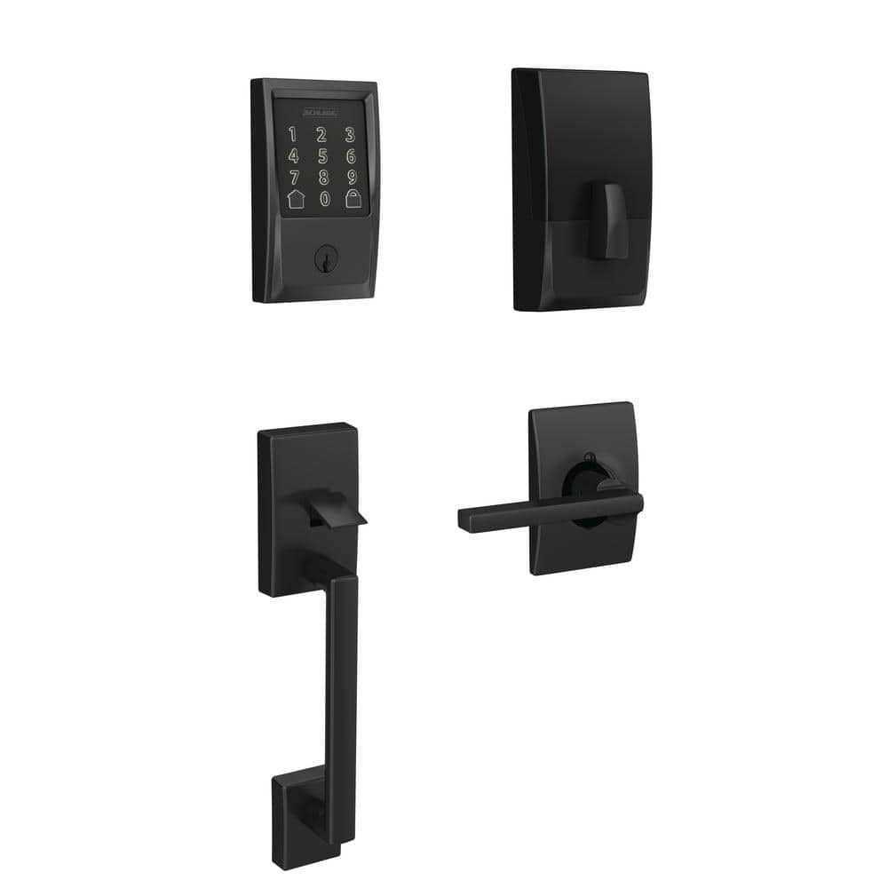 Schlage Century Matte Black Encode Smart Wi-Fi Deadbolt with Alarm and Entry Door Handle with Latitude Handle and Century Trim 204003