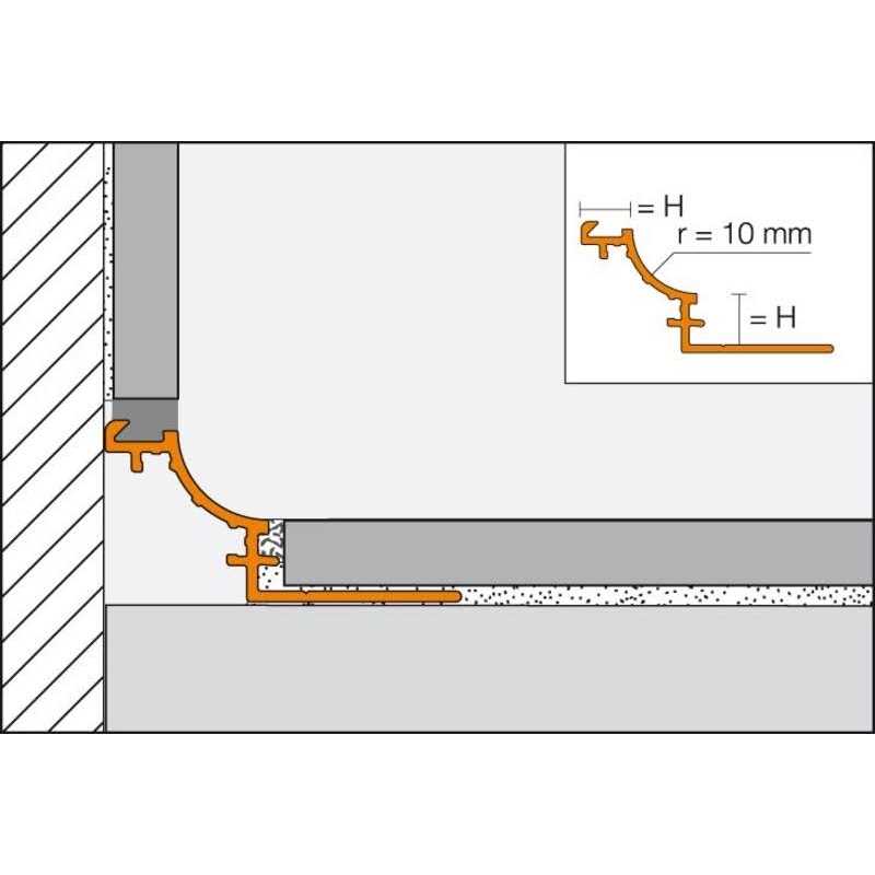 The DILEX-AHKA is an anodized-aluminum, cove-shaped profile for transitions between walls to be tiled and previously finished floors. Features a single trapezoid-perforated anchoring leg that is secured in the mortar bond coat and a dovetailed channel which is bonded to floor surfaces. Features a 3/8-in wide radius cove section which prevents the accumulation of dirt, making cleaning simple. Prevents surface-water penetration and meets the strict hygienic requirements of commercial kitchens, bathrooms and food-processing plants. Ideal for tiled environments where a sanitary cove base is desired. Integrates with DILEX-AHK and RONDEC profiles. Profile length is 8-ft and accommodates tiles that are 5/16-in thick.