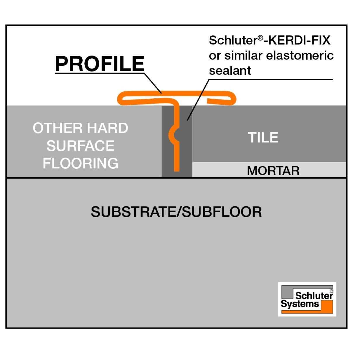 Reno-T is designed for transitions between hard surface floor coverings that are the same-height. It can be used to retrofit an existing installation or can be installed during the tile installation. Reno-T overlaps the edges of the floor coverings to protect the edges against damage. Installation is quick and easy by filling the joint between the floor coverings with an elastomeric sealant, like Schluter-Kerdi-Fix and pressing the profile into the joint.