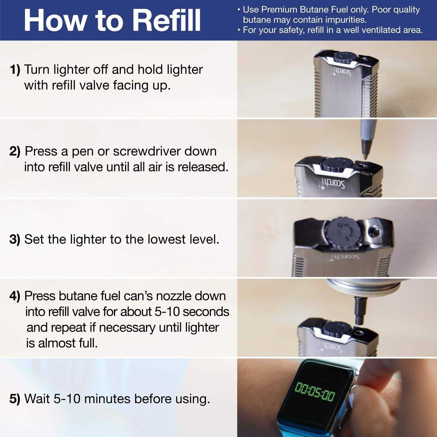 Scorch Torch Quality Scorch Torch Products are well known in the industry for its Unrivaled Quality and Attention to Details. This torch is no exception, it is the pinnacle of Scorch Torch’s Product Quality capable of producing intense flame reaching temperature of 1300C / 2500F Adjustability This Refillable Torch (BUTANE NOT INCLUDED) features a innovative, industry leading Thumb wheel flame adjustment making it very easy to adjust the flame size with one hand Innovative Designed to be operated with one hand featuring Thumb wheel flame size adjustment, Trigger Style ignition and Press Button Flame Lock. This torch can be operated with one hand only without using the other hand to lock and adjust the flame. Ergonomic The grip is design for efficiency and comfort featuring optimal grip angle and Thumb Rest at the top of the grip allowing comfortable and powerful griping position. Craftsmanship & Safety Precisely CNC Machined Aluminum Handle and Heat Shield together with use of anti-slip material on the handle provides extra layers of safety measure This is a Multi-Function Refillable Torch /b offered by Scorch Torch /b , a industry leader in Torch manufacturing. br br This Torch Features: /b li Thumb-Wheel Flame Size Adjustment li Flame Lock Button li Trigger Style Ignition br br This Torch is designed to allow its user to operate the torch with only one hand, all the torch’s features listed above can be activated/adjusted with the thumb and Index finger br This Torch is refillable and can product a intense flame capable of reach a temperature of 1300C / 2500F br br To prevent overfilling and cause leakage, please refer to the following Refill Tips /b li User Premium Butane Fuel only. Poor quality butane may contain impurities. li Only perform refill in a well ventilated area. li Make sure the lighter/torch is completely OFF li Make sure the tank is empty li Set the flame level to the lowest level li Press the butane fuel can’s nozzle down into the refill valve for about 5-10 seconds and repeat if necessary until it is almost full li Wait 5-10 minutes before using br br DOs and DON’Ts /b li Always use caution when using lighters/torches li Only use it in well ventilated area li Use caution when adjusting flame sizes, point it away when doing so, do it slowly li DO NOT /b make excessive flame size adjustment abruptly. li Never /b point the nozzle at you or any other person, always point it away. li DO NOT /b Leave the lighter/torch unattended unless you are absolutely sure it is OFF and no flame coming out from the nozzle. li DO NOT /b try to light the torch with another lighter if there is no flame after pressing on the trigger, there may be un-burnt butane gas around the area and attempting to light it with another lighter will cause the un-burnt butane to ignite! br br Contact your seller immediately /b if you have issue or question about how to use this torch. DO NOT /b attempt to fix it yourself.