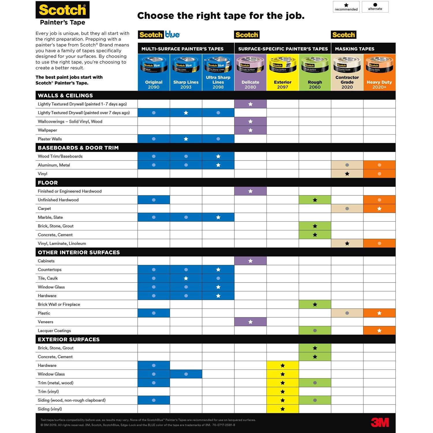 Scotch Contractor Grade Masking Tape is a general-purpose masking tape designed for use on non-damageable surfaces. Use on vinyl, carpet, metal and plastic for the protection you need to get the job done. This tan-colored masking tape pack contains adhesive tape that can stay on for up to three days on interior surfaces and one day on exterior surfaces and removes easily without leaving behind a sticky residue. For those looking for a masking tape 1 inch length, this product is a perfect choice because its made with strong adhesive to be used both indoors and outdoors. Made from 50% renewable resources with a core made from 70% post-consumer waste, this tape is made in a site certified for energy management to provide you with a sustainable painting product. The application is simple. Make sure the surface is clean, dry and dust-free so your masking tape sticks properly. Apply the tape onto the surface while pressing down firmly. When using as a painter’s tape, let the tape set for 30 to 60 minutes before painting. Removal is just as easy. Wait until paint is dry to the touch before removing the used paint masking tape. Lift the tape up by slowly pulling it back on itself, then remove it at a 45-degree angle. With a full range of adhesive solutions, Scotch Brand delivers confidence in superior results to get the job done well and effectively the first time. By choosing to use the right tape, youre choosing to create a better result. From the brand that is No. 1 trusted by professional painters (1), Scotch Brand offers a full line of tapes specifically designed for the various demands of the project/job. (1) ScotchBlue and Scotch brands are ranked as the most trusted based on a 2020 Kantar US Brand Health Survey.