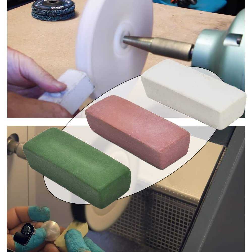 Buffing Wheels by SCOTTCHEN. Details:Package includes: 1pc 35g polishing compound red coarse 1pc 35g polishing compound white fine 1pc 35g polishing compound green super fine Dimension: L x W x H: 2-3/8” x 7/8” x 5/8” Weight: 35g/pcs Materials: Animal Fat. Features: What’s the function of these buffing compound? →These Buffing/Polishing Compounds Kit great for achieve a smooth and mirror finish on a widely variety items surfaces, help you handle most kinds of projects. What items they are suitable be used for? →The polishing Compounds are Idea for wood, plastic and variation metals polishing buffing, such as: stainless steel, steel, iron, aluminum alloy, brass, bronze, copper, silver, gold etc. How to use? →The buffing wheel Compounds are designed to be applied on buffing wheels by simply turning a buffing wheel on a grinder/motor/drill and lightly press the compound against the wheel while the heat/friction will transfer the compound onto the polishing wheel. Why choose…