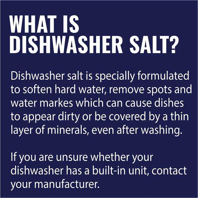 Many dishwashers have a built-in water softener to optimize cleaning results. To function perfectly, this softening unit requires special salt. Dishwasher Salt is a special water softener salt for dishwasher compartments dedicated to using salt to soften water. Hard water can decrease the efficiency of your dishwasher and leave mineral deposits on your dishes. Dishwasher Salt by Sea Salt Superstore helps prevent mineral deposits in your dishwasher jets and on your dishes. As a Miele dishwasher salt or Bosch dishwasher salt, or for use in any compatible machine, use this dishwasher softner salt to help make your premium dishwasher clean as well as the first day you installed it! The best part is, it’s very easy to use. Simply add salt to the dishwasher’s salt unit and close. Check the level and refill as necessary. Consult your dishwasher manual for exact, model-specific directions, to make sure it runs smoothly. Then enjoy your incredibly clean dishes and sparkling glasses – rinse and repeat!