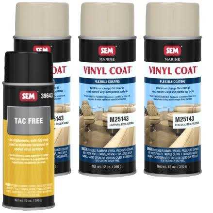 Vinyl Coat is an elastomeric coating formulated to match, restore, or change the color of most marine vinyl surfaces and flexible, rigid plastics. The formulation is not a dye, but rather a fade-resistant, flexible, and permanent coating with UV inhibitors. Vinyl Coat will not crack and features superior adhesion. Simple to use, the coating dries quickly to reveal your improved color appearance.