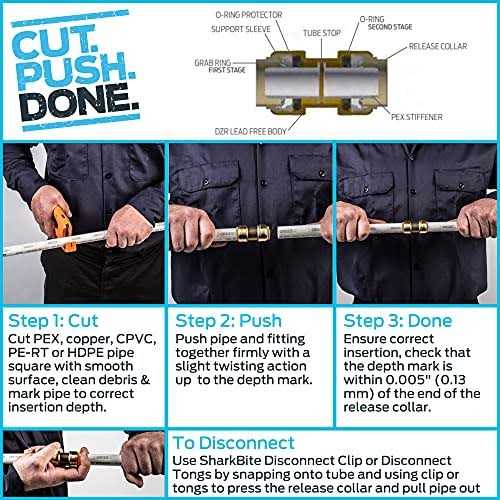 • INSTALLS IN SECONDS: SharkBite fittings requires no special tools, no soldering, no crimping or glue. Just push to create a watertight seal