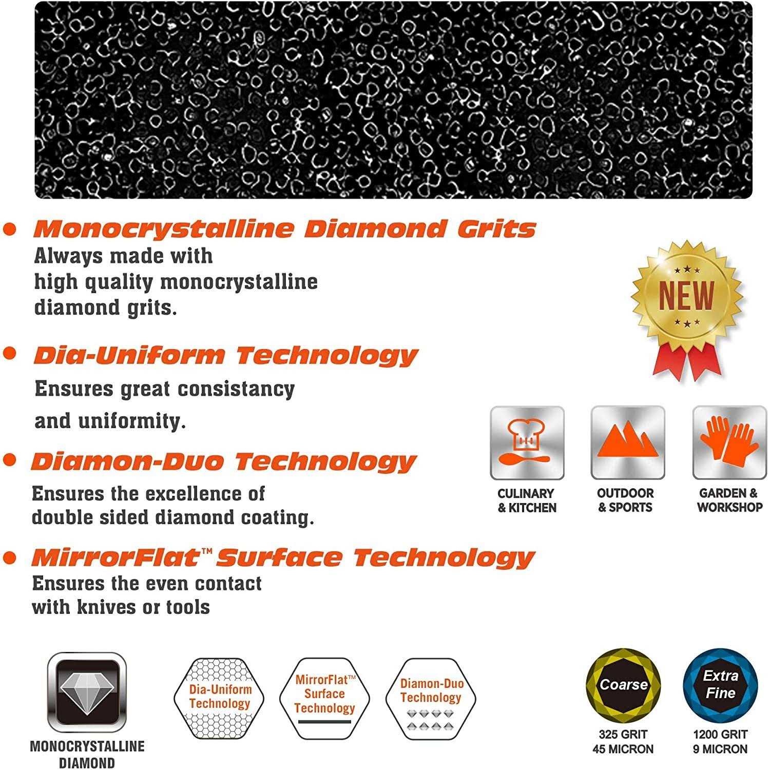 SHARPAL 162N Dual-Grit Diamond Whetstone that measures L 8 inch x W 3 inch is capable of handling a wide variety of edges including kitchen and pocket knives with either a single or double bevel on the blade, tools and much more. With MirrorFlat technology, hard wearing surface and durable design, it guarantees consistent, even sharpening for years of dependable use. It is double-sided with both coarse and extra fine diamond surfaces. Use the coarse diamond stone 325 grit (45 micron) to quickly and easily restore a dull or damaged edge. Use the extra fine diamond stone 1200 grit (9 micron) to hone. Sharpen dry. No messy oil needed. It comes with a high-impact plastic self-storing case with non-slip rubber pad that can be used as a stone base while sharpening. More value-added gadget is the patent pending Angle Pyramid Sharpening Angle Guide integrated with 4 angles-14, 17, 20, 25 for choice for almost all kinds of knives.