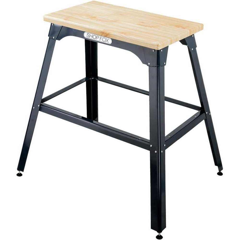 Great for bench-top tools like chop saws drill presses planers scroll saws and bandsaws. Support cross braces on top provide incredible strength and capacity. Flared legs and adjustable rubber feet ensure stability and reduce machine vibration. The particle-board table top (with faux butcher block laminated finish) measures 13″ x 23″ and is 30-1/2″ tall. Bottom measures 21″ x 32″. 700 lb. capacity. Please note: This product is not recommended for use with casters.