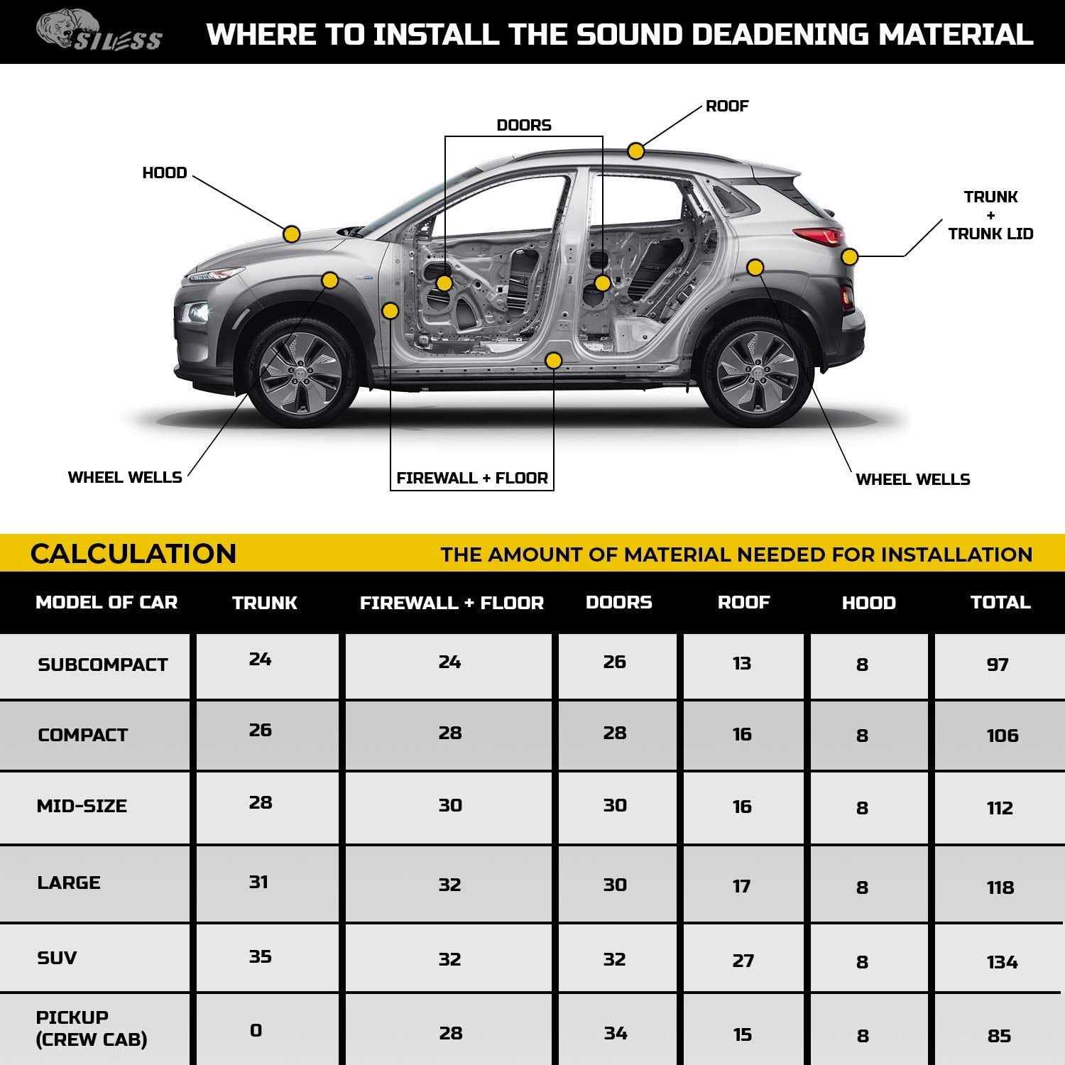 Sound Deadening is one of the most effective things you can do to your car to improve sound quality and eliminate road noise. SILESS was originally designed for the automotive industry and engineered for car soundproofing and sound dampening. By reducing or dampening sound vibration in the metal panels of your car, you can eliminate road noise. Whether you are trying to improve the quality of your car stereo or give your vehicle that “luxury car” feel, SILESS is the ideal material. Unlike some other companies, who use repurposed asphalt roofing materials, SILESS created industry approved Bmastic technologically advanced formulation that is lightweight, easy to cut, super sticky, and 20-30% more effective than any competitors on the market. Some companies use technology and processes created over 10 years ago, and selling their products at a price 3 times higher than Siless. SILESS will install easily and stick to all and any interior surfaces, such as; floors, doors, roof, hood, trunk lid, quarter panels and will easily stick to a any other surface and will stay in place without any special preparation, and without any messy drippings and odor. Installing together SILESS VIBRO and SILESS LINER – such as SILESS 157 mil and you’ve got a ride with even more noise-blocking outcome. First layer of SILESS VIBRO provides 65% off road noise and vibrations and then second layer of SILESS LINER provides 35% coverage from excessive heat. Together, it is ULTIMATE SOLUTION for your sound dampening needs. Finally, SILESS today – the most advanced, industry approved, ultimate sound dampening material on the market.