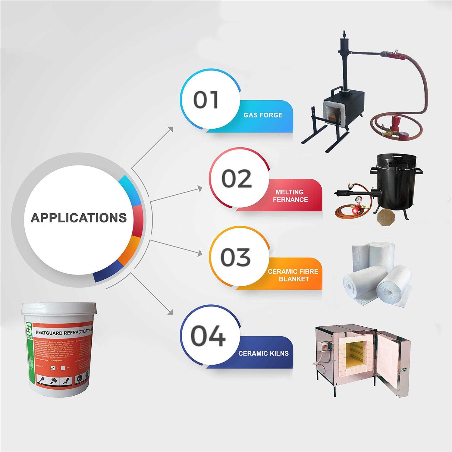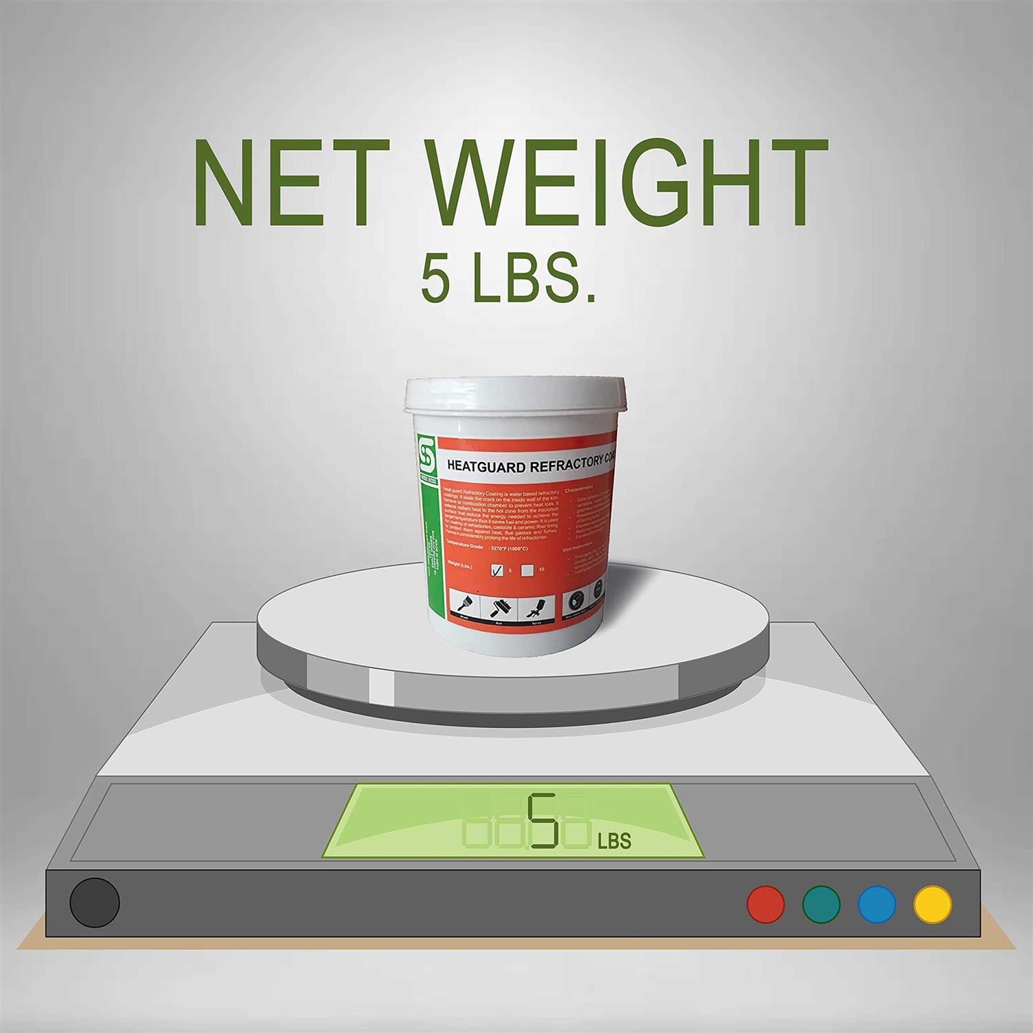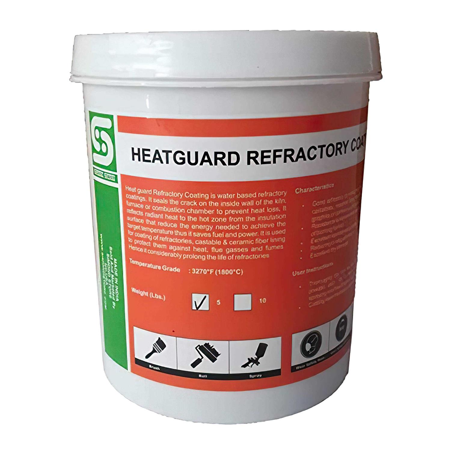 MATERIAL: This refractory coating is a combination of small particles and components of alumina and silica that reflect radiant heat into the forges, foundries, kilns, or furnaces to maintain the efficiency of the temperature. DURABILITY: Our heat refractory coating makes a thick and durable layer on the ceramic fiber insulation and it resists your potential propane heat withstood working temperatures up to 3270°F. EASY TO APPLY: This heat resistant coating is too easy to apply, just mix with water and blend it for 8 to 10 minutes to avoid air bubbles, apply it on a ceramic fiber blanket in a blacksmith forge, ceramic kiln, or foundry furnace, and let it dry. ENHANCED EFFICIENCY: This refractory coating protects the wall insulation inside the kilns, furnaces, or combustion chamber and prevents heat loss thus saving fuel or power. APPLICATION: Effective as a fire refractory coating for ceramic fiber insulation in the gas forge, ceramic kilns, inductions, and foundry furnaces. Refractory Coating Heat Guard br br The refractory coating is used as a cover for ceramic fiber insulation or any refractory products. br The refractory cement for ceramic fiber material works by reflecting radiant heat into the furnace, kiln, or forge to achieve high temperatures quickly and efficiently, it prevents heat loss and thus saves fuel or power. br 5 lbs. refractory coating can cover a 12.16 sq. ft. area. br Refractory coating heat-guard is a water-based coating that can resist temperatures up to 3270°F (1800°C). br It is used as a fireproof coating in a gas forge and ceramic fibers lining to protect them against potential heat of direct flames, furnace heat, and fumes. br Hence it considerably prolongs the life of refractories. br br Benefits br br Excellent Dry Strength br Adds potential strength to your ceramic fiber blanket br Excellent heat resistance coating for furnace, inductions, and forge. br Best Adhesion to refractory bricks, ceramic fiber insulation, graphite or carbon crucibles, etc. br br Specifications: br br Material: Refractory br Type: Coating br Weight: 5 lbs. br br Note: Add 50% (by mass) clean tap water to it for spraying or brushing application. The coating layer thickness should be 1.5 to 2 mm.