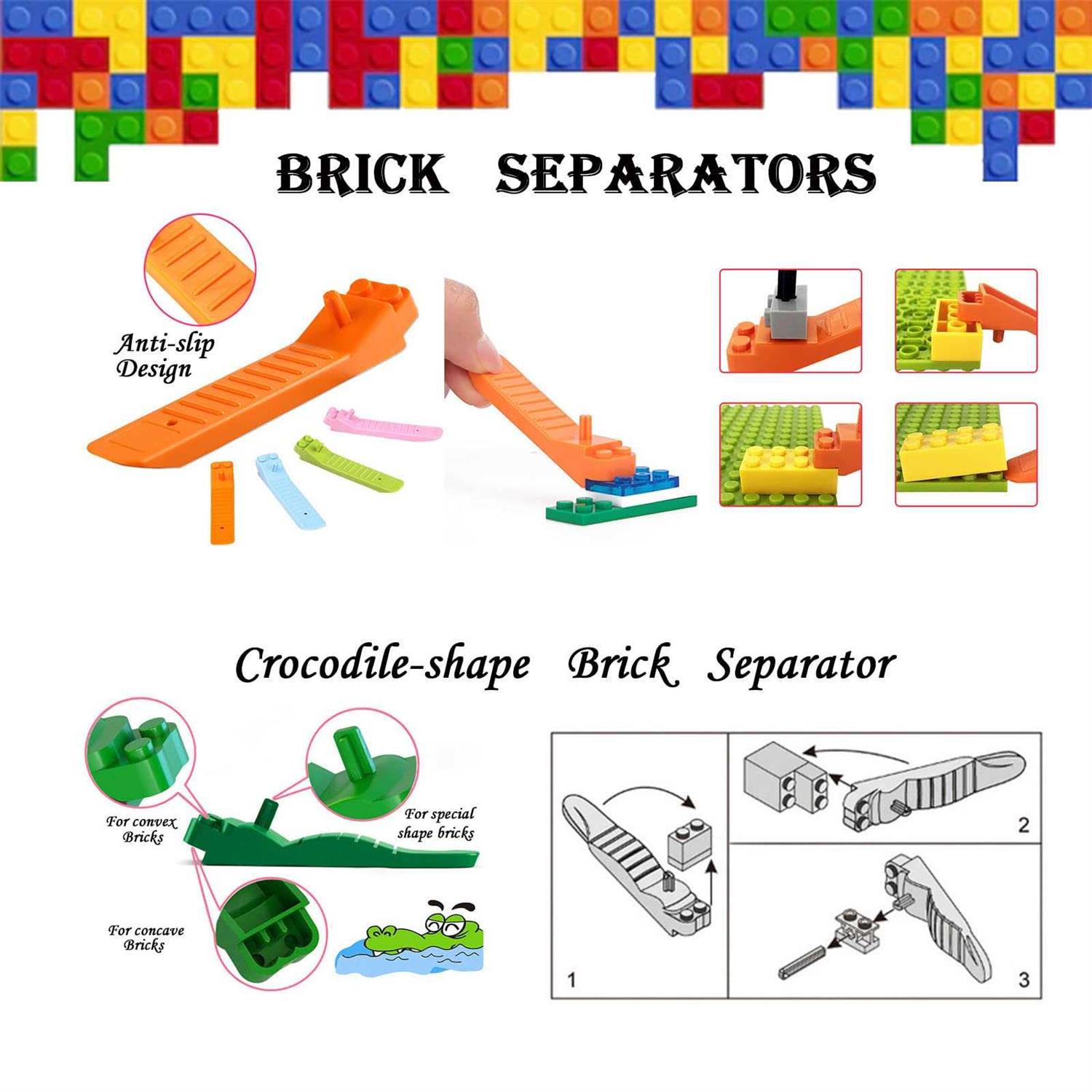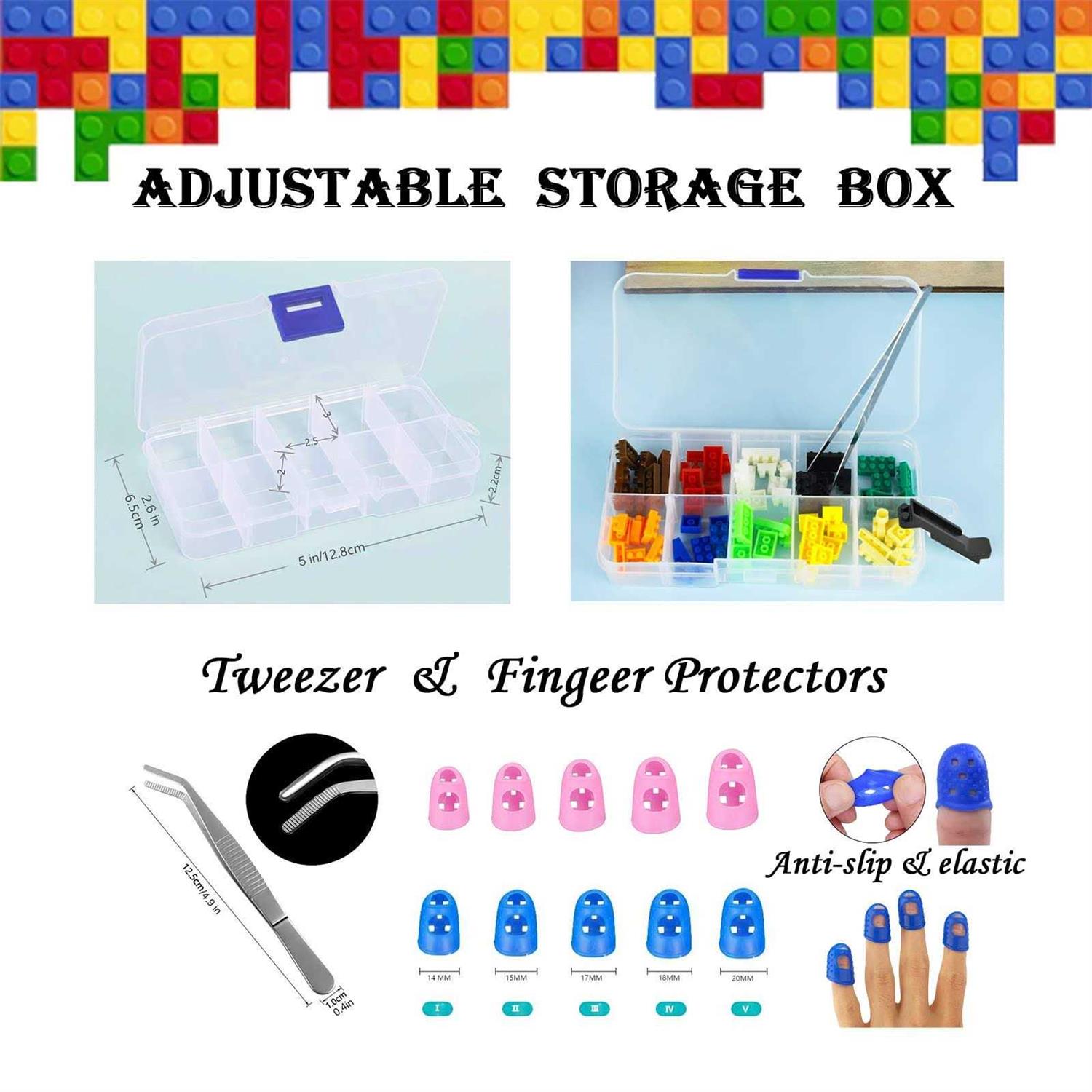 PRACTICAL AND PROFESSIONAL TOOL SET. This upgraded building blocks tool kit is specially designed for toy building bricks lovers and it is compatible with LEGO & Technic and building bricks from most major brands. SAFE AND PREMIUM QUALITY MATERIALS: Made from high quality materials like ABS plastic, stainless steel, aluminium alloy and silicone, our assembly and disassembly building blocks tools are odorless, harmless, solid and durable, super safe for both kids and adults to use. The package tin box is strong and great for storing these tools. MULTIFUNCTIONAL HAMMER AND BRICK PLIERS: Both the hammer and pliers have silicone protectors by the head, protecting the bricks or blocks from any possible damage. The hammer is made of two parts (connect or disconnect with the cross bolt) with different functions to help install or remove the blocks. The Pliers can separate bricks with different sizes or shapes quickly 5 BLOCK SEPARATORS AND TWEEZERS: The tweezers with handle at a proper length will help you to pick small parts or bricks easily for brick assembly. There are 5 brick separator with different colors and shapes, they can work for regular size blocks and the small ones are specially used to separate mini blocks when you need disassembly 5 FINGER PROTECTORS AND ADJUSTABLE STORAGE BOX: You may have suffered from sore fingertips from toy bricks building for a long time, here the silicone made finger guards will bring you a comfortable touch and happy blocks assembly without the pain. The small storage box can be adjusted for different size and compartments by taking away or putting up the little separation chips, so you can classify the bricks by its shape or colors for each assembling step.. SIOYTOER Building Blocks Tool Kit LEGO Accessories Classic Brick Separator tools Compatible with LEGO &Technic Mini Blocks Multifunctional Hammer Pliers Tweezers Adjustable Brick Storage Box Finger Protectors in Tin Box.
