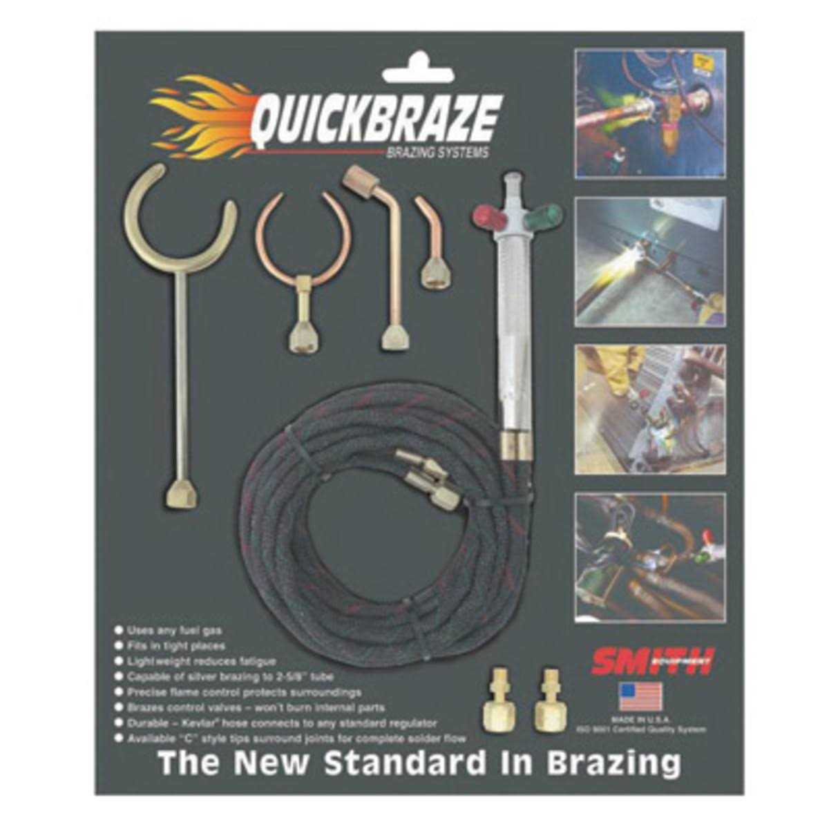 Smith Equipment Quickbraze Brazing Torches Brazes solenoid and expansion valves so quickly that heat is unable to transfer to internal parts protecting them from damage and eliminating the need for messy and costly heat sink materials. Twin flame tips solder coil return bends quickly and evenly. Revolutionary patented “C” style tips provide 100% flame wrap for fast efficient and even heating. “C” style tips also assure even heat on the blind side of the braze joint.