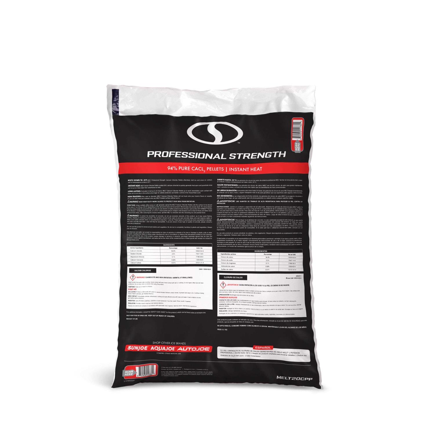 Tackle tough ice and snow build-up with PRO results: MELT Calcium Chloride Pellets the professional-strength, long-lasting de-icing formula from SNOW JOE. Bid farewell to amateur solutions and embrace the power of professional-grade ice control with this exceptional formula. MELT20CPP is engineered for the toughest winter challenges. With its non-clumping, professional-strength formula, it effortlessly tackles ice and snow, even in sub-zero conditions. Unlike outdated alternatives, when used correctly, MELT Calcium Chloride Pellets won’t track indoors, ensuring your home stays clean and safe. This premium formula keeps working for up to a full 24 hours, making it an ideal pre-treatment solution to prevent ice buildup from the very beginning. MELT20CPP Calcium Chloride Pellets contain an impressive 94% calcium chloride, swiftly generating heat upon contact to penetrate snow and ice up to three times faster than conventional ice melts. When the elements are relentless, trust MELT20CPP to deliver fast, effective results. Don’t compromise on ice controlchoose the professional way. When the ice builds up, take control with confidence. Go With Joe: MELT Calcium Chloride Pellets, from SNOW JOE.