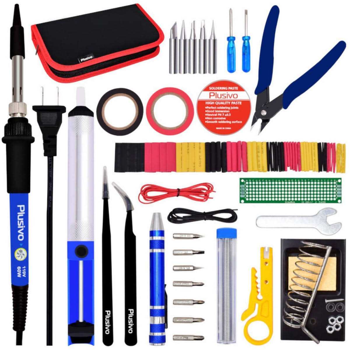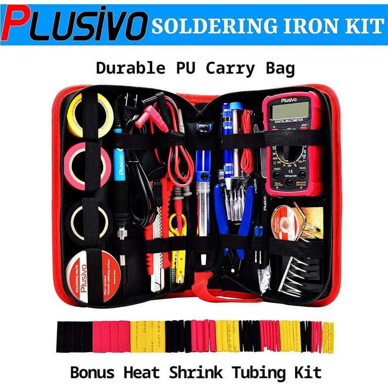 Irons by Plusivo. Details:You Want – A complete soldering kit that includes common tools used for soldering and now it comes with a multimeter and some bonus items. You Need – A durable soldering kit with safe iron stand with dual safety design and heat-insulated and anti-scalding silicone handle to protect users from burn.. You Desire – A premium soldering kit that is easy to carry, transport, and use. You Get – Everything you want, need and desire with the Plusivo Soldering Kit. Ergonomic design – The Plusivo Soldering Kit is a joy to use. It comes with a PU carry bag that allows you to easily store the tools. Just open the bag and pick up the tool that you need. You’ll never want to be without the Plusivo Soldering Kit – Don’t delay, buy today. Add to cart now! Package Includes – Adjustable Temperature Soldering Iron (60 W) with Heat Resistant Cap – Soldering Iron Stand – Mini Wire Stripper Tool – Curved Tweezers ESD-15 – Straight Tweezers ESD-11 – Tin Wire Solder Tube – …