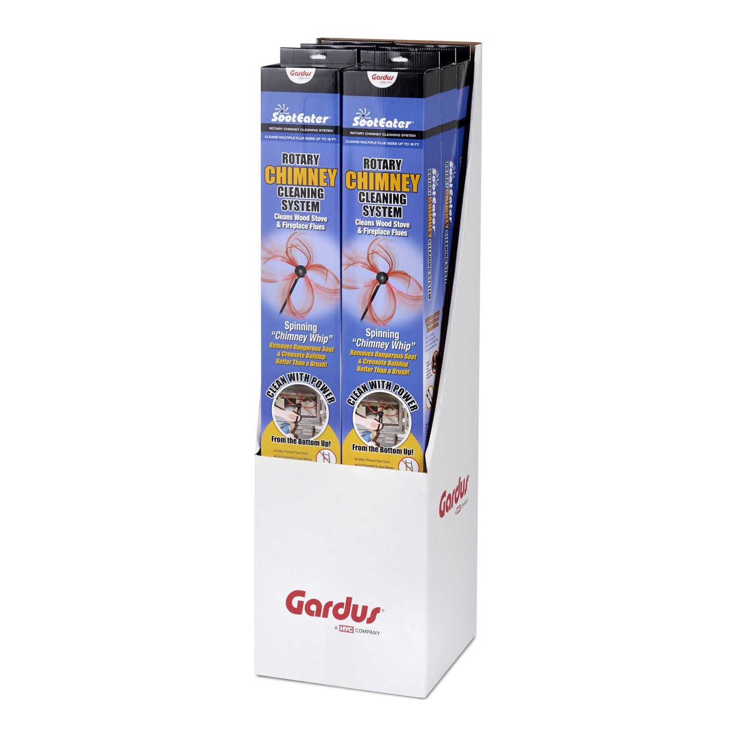Cleans wood stove and fireplace chimneys from the bottom up utilizing flexible rods with button connect fittings. The spinning chimney whip can be trimmed to fit and removes soot and creosote better than a brush.