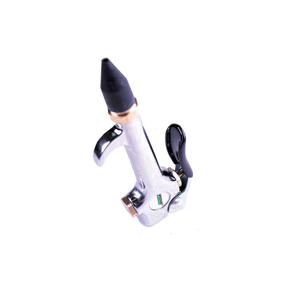 Speedaire Pistol grip thumb lever with rubber nozzle is designed specifically for hard-to-reach applications and includes an extension with a high-flow safety nozzle. Durable aluminum construction with thumb lever provides control and is easy to adjust air volume.