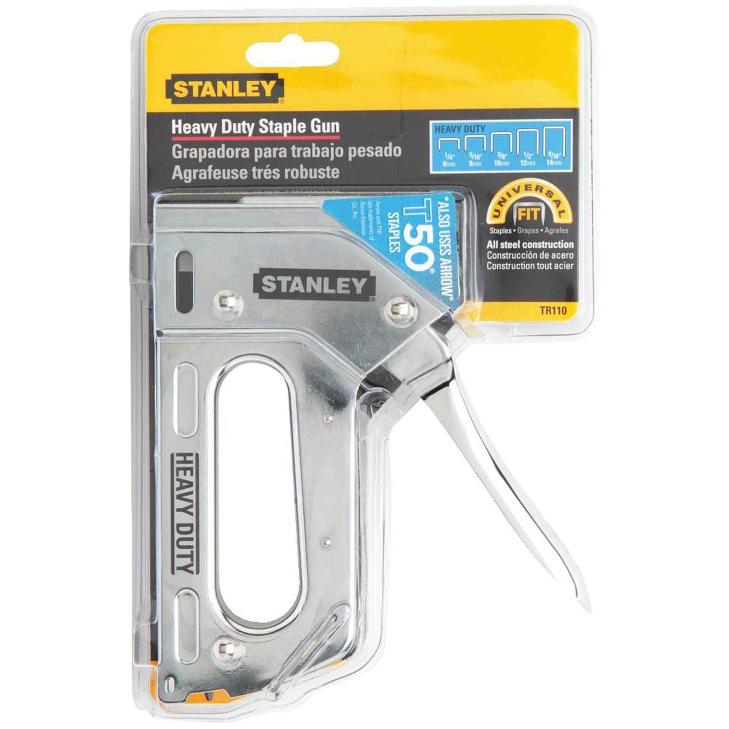 This Stanley TR110S Heavy -Duty Steel Staple Gun is a smart choice for everyday jobs at home, work or at the office. It’s lightweight and comfortable for sustained use when doing various projects. This heavy-duty hand stapler also has a convenient handle lock to keep fingers safe. The durable chrome-plated body is made of steel for a longer-lasting performance. This tool features a Quick-Jam clearing mechanism that makes it easy to clear out any stalled staples so you can get back to work. It can be used to complete a variety of projects or repairs around your home, including applications involving upholstery and much more. This tool uses heavy-duty staples that will stay put in different types of material.