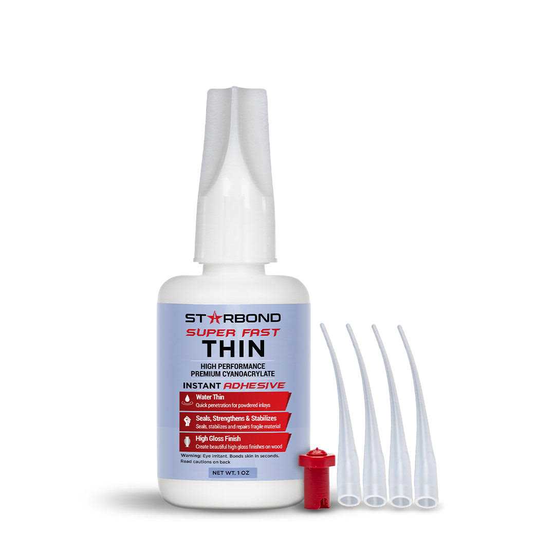 Starbond Super Fast Thin CA Glue EM-02 can’t be beaten when it comes to getting into tight spaces on porous surfaces. Whether you’re working with powder inlays, ceramics, softwood, unpolished rocks, or even fossils, Super Fast Thin CA Glue penetrates and stabilizes any crack or seam effortlessly through wicking capillary action. This watery-thin adhesive also makes a stunning CA finish and polish when applied as several coats, sanded in-between, and buffed to a brilliant shine. Want to keep the hold, but prevent absorption? No problem – Starbond Accelerator ( Aerosol or Pump Sprayer ) keeps glues from seeping into porous surfaces – the instant cure for unwanted wicking! Need replacement applicator tips? Find them here. Compare Glue Types > Includes: 1 ounce: (1) clog-free stopper, and (4) micro-tips for precision. 2 ounce: (2) applicator caps, (1) clog-free stopper, and (8) micro-tips for precision. 16 ounce: (1) Easy dispensing yorker spout, (4) empty 2 ounce bottles, (6) applicator caps, (2) red pin caps, (1) clog-free stopper, and a bag of micro-tips for precision. Compatible with: Wood Metal Rubber Leather Ceramics Gemstones Rocks & Minerals Carbon Fiber Fiberglass PVC and Most Plastics Applications: Repairing and filling cracks, inclusions, voids, and knots in the wood Woodturning and knife handle finishes for a hard, clear, and waterproof coat Wicking into and stabilizing guitar frets Installing bindings and purflings on stringed instruments Gluing and repairing guitar inlays on the headstock, body, and fretboard Fossil preparation through infiltration and stabilization of the fossil before extraction Repairing small cracks in the stone Metal and turquoise inlays Jewelry manufacturing and repair Furniture refinishing and antique repair Ceramic repair Marble, Granite and Quartz repair Bonding fiberglass to balsa wood Taxidermy