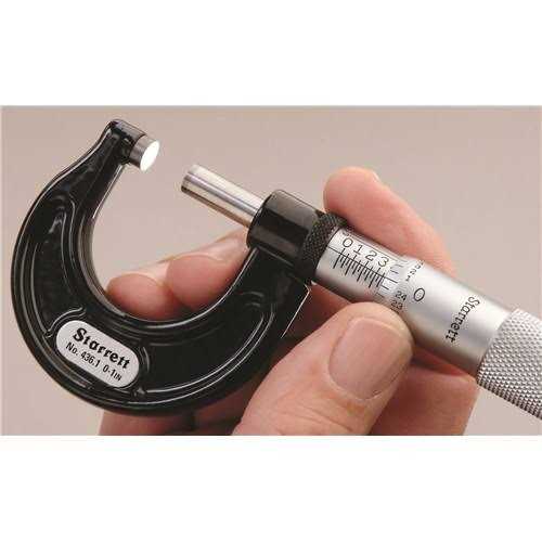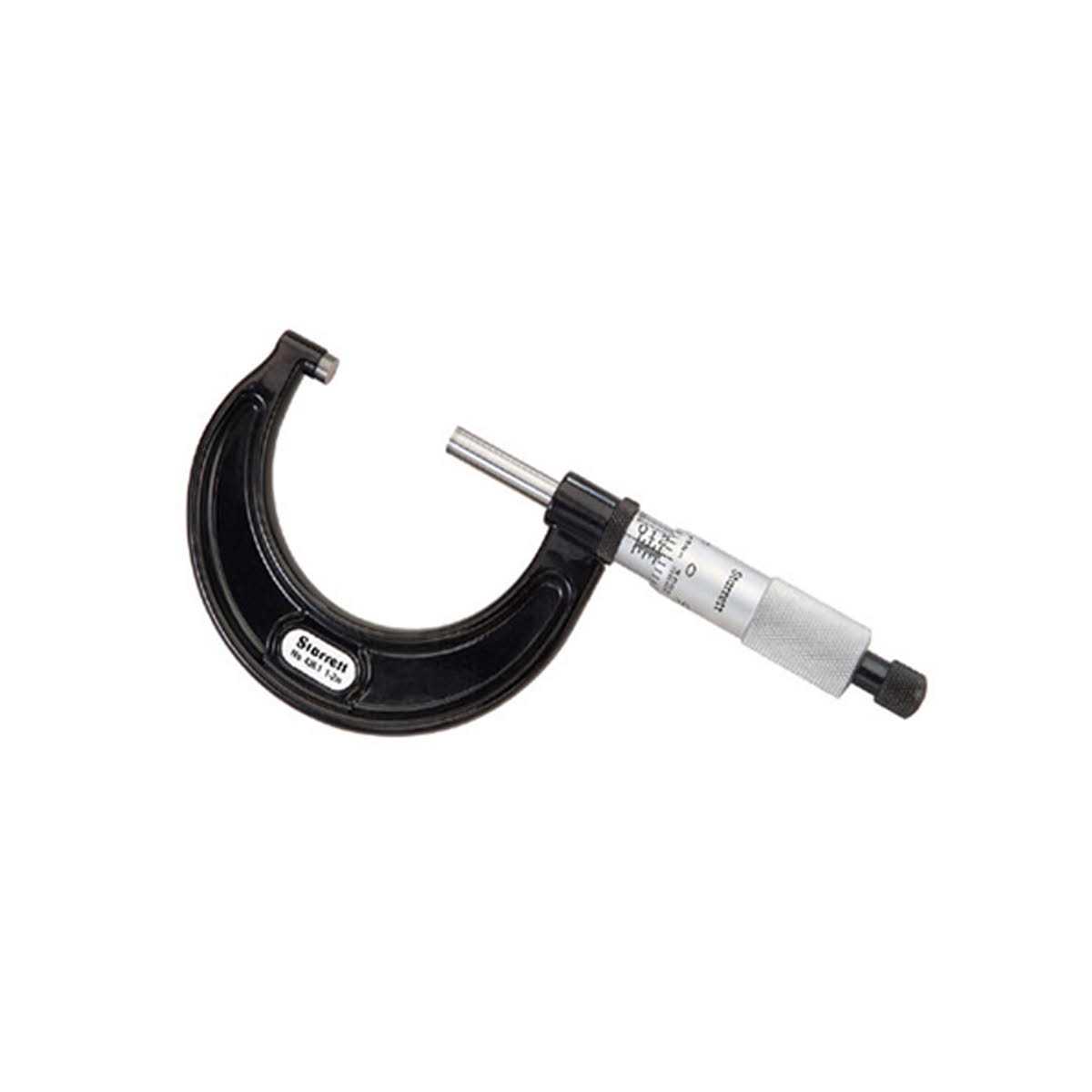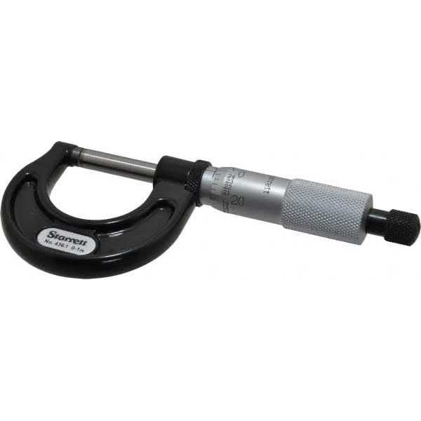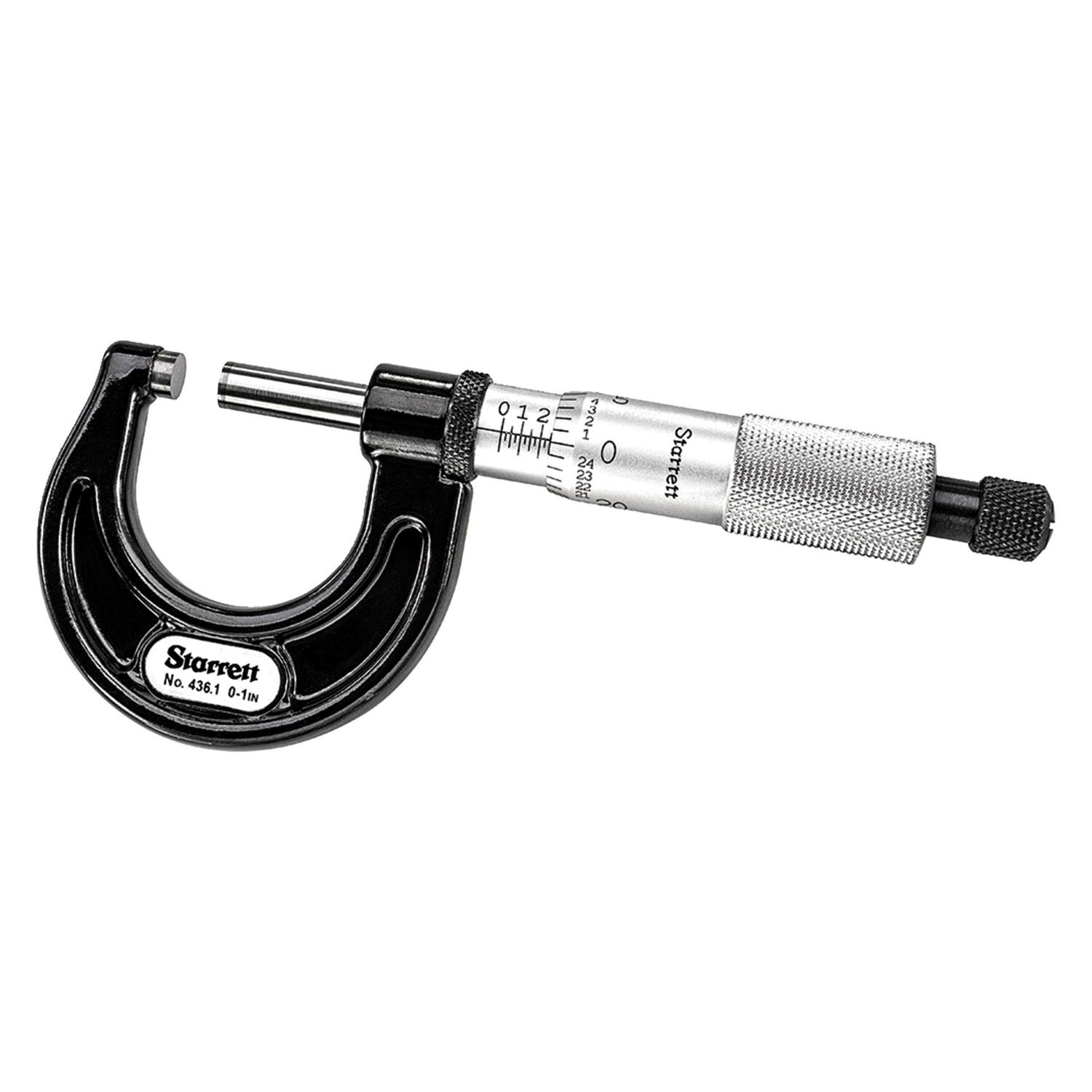 The Starrett 436.1 series outside micrometer has a vernier scale in inch units for taking precise outside diameter (OD) measurements, a tapered frame for measuring narrow slots and tight places, and a ratchet-stop mechanism that helps provide uniform pressure for precise, repeatable measurements. The micrometers steel frame has a baked enamel finish for protection and durability. The vernier scale on the thimble and sleeve is graduated to 0.001 or 0.0001 depending on the model, with a satin chrome rust- and glare-resistant finish. The spindle and anvil have flat, micro-lapped measuring faces for accuracy and are carbide-tipped for wear resistance. A knurled ring-type lock nut helps provide secure locking of the measurement position.Micrometers are precision measuring instruments that use a calibrated screw to measure small distances. These measurements are translated into large rotations of the screw that are then able to be read from a scale or a dial. Micrometers are typically used in manufacturing, machining, and mechanical engineering. There are three types of micrometer outside, inside, and depth. Outside micrometers may also be called micrometer calipers, and are used to measure the length, width, or outside diameter of an object. Inside micrometers are typically used to measure interior diameter, as in a hole. Depth micrometers measure the height, or depth, of any shape that has a step, groove, or slot.The L.S. Starrett Company manufactures precision measuring tools, metrology and testing equipment, and saw blade products. The company was founded in 1880 and is headquartered in Athol, MA.