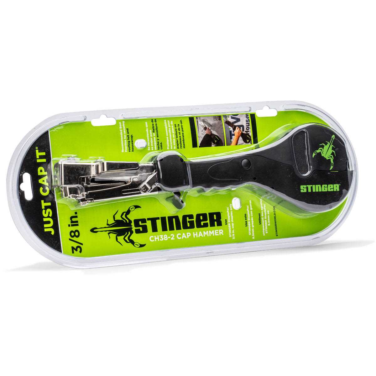 The STINGER CH38-2 Cap Hammer is the economical, non-pneumatic alternative to stapling. The CH38-2 is ideal for installing housewrap, underlayment, and rolled insulation in a fraction of the time it would take when using traditional staples. This plastic cap stapler is designed to be used with only one hand, leaving the other hand free to adjust material as needed.With this system, every nail is automatically driven through a small, circular plastic cap that effectively seals the holes created by the fastener. This ensures that no water will leak through the underlayment or housewrap because of holes left by the fasteners. In addition, capped staples provide 20 times the holding power of non-capped staples, even though fewer fasteners are actually needed.