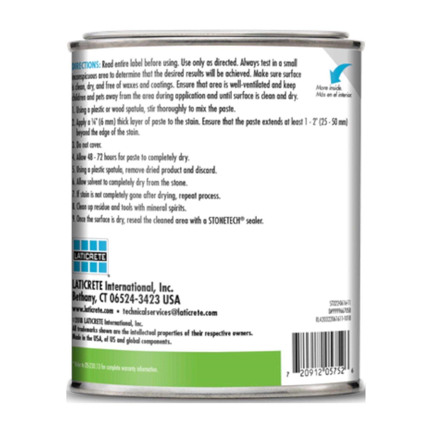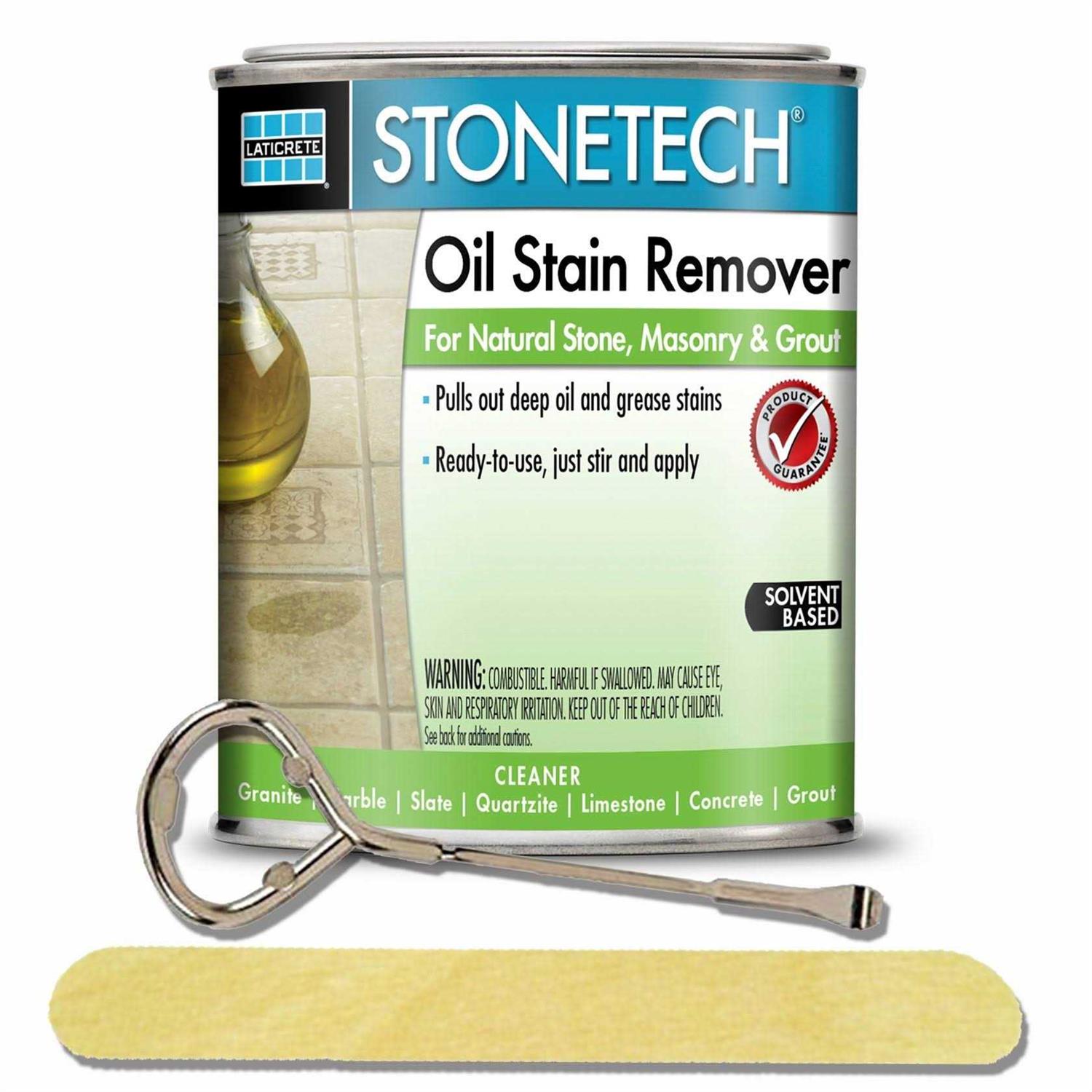 Designed to help remove deep, set-in oil-based stains without discoloring the surface Easy-to-use product leaves no residue behind Recommended surfaces include: marble, granite, limestone, travertine, slate, sandstone, grout for ceramic and porcelain tile, masonry, and concrete Approximate coverage is 15-30 square inches at 1/4″ thickness per Pint StoneTech Oil Stain Remover is designed to remove oil-based stains without discoloring the surface. Always test in a small inconspicuous area to determine that the desired results will be achieved. Make sure surface is clean, dry, and free of waxes and coatings. Ensure that area is well-ventilated and keep children and pets away from the area during application and until surface is clean and dry.