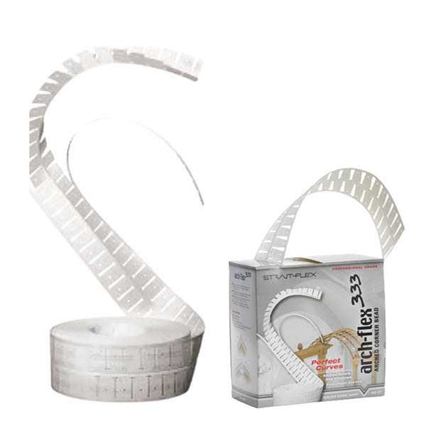 Arch-Flex 333 is the first arch product that comes on a roll. Designed for all radius curves, Arch-Flex also resists dents and paint chipping, cuts easily with a utility knife or scissors, is applied with all-purpose joint compound, and will not rust. The tape is manufactured with patented tear strips to create easy straight-to-curve transitions. To apply, measure entire curved application by using Arch-Flex 333 as a tape measure. Cut to measured length plus 1 in. Fold Arch-Flex 333 completely in half at crease and remove tear strip by folding along perforations and pulling. Leave tear strip intact where a straight-to-curve transition is required. Apply all-purpose compound to corner. Starting from one end, press Arch-Flex 333 firmly into compound. Re-cut length to fit if needed. Wipe down compound and adjust to a smooth curve. Apply second coat immediately and let dry. Apply final coat, let dry, and sand.