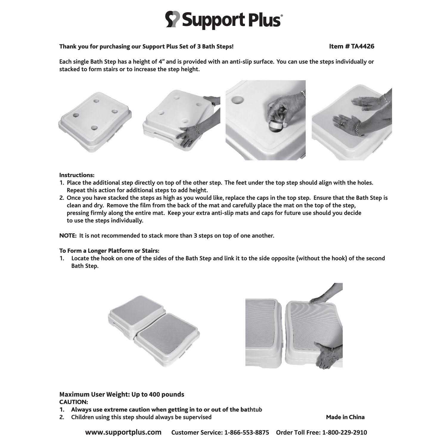 The strong, secure design of these convenient, stackable bath steps make it easier for children, the elderly, the injured or anyone else with limited mobility to get in and out of the bath tub safely. The top of these extra-large platforms are covered with slip-resistant, textured rubber for additional stability while stepping in or out of the tub, even when wet. Low-profile rubber feet keep them from sliding on smooth or wet surfaces, and a wide, stable base prevents the steps from tipping. Each step provides an extra four inches of height. Two stacked together provides an extra 6 inch, and stacking all three steps gives an extra 8 inch of height. Constructed with a sturdy, match-anything white plastic, the bath steps safely support up to 330 pounds each. They make great step-stools when placed in front of a sink in the bathroom or kitchen, and provide support for getting in and out of a car or bed. Lightweight design makes it easy to transport from room to room, or while traveling. Bath Safety Steps each measure 19 1/2 inch wide x 16 inch deep x 4 inch high. Set of three.