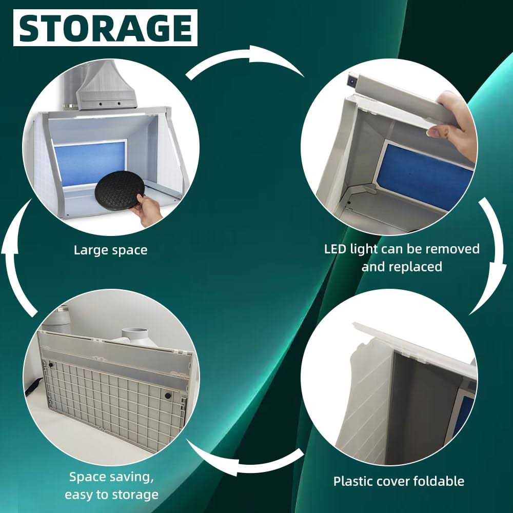 Input:AC100-240V 50/60HZ; Air flow: 9m3 /min Easily Folds into a Suitcase,shape w/handle for carrying or storing; Exhaust Extension Hose: Flexible Hose that Extends up to 5.6 Feet (67 Inches) To Keep Particles and Vapors away from your work Environment, Place the 1″ High x 9.5″ Wide Exhaust Hose Outlet between a Small Window or Door Gap Power(Led light):12 W; Luminous flux(Led light):2340LM; Revolving Turntable: Allows you to Reach all the Areas to be Painted. Features: 1. Embedded LED light brings extra details 2. Designed to be easily deployed and carried around 3. Working space could be doubled if assemble two of the machines 4. Removable accessories(workbench part) for proper cleaning and replacement 5. Universal adapters(100-240V) for using in different countries 6. Low noise while working 7. Oil free design for better environment Specification: Motor:DC12V 5A Input:AC100-240V 50/60HZ Air flow: 9m3 /min Working voltage(Led light):12V Power(Led light):12 W Luminous flux(Led light):2340LM Noise level: 53db Extend dimension: 55X47.8X35.8 CM Shrink dimension: 55X27X32 CM Net Weight: 3.8 KG Exhaust Extension Hose: Flexible Hose that Extends up to 5.6 Feet (67 Inches) To Keep Particles and Vapors away from your work Environment, Place the 1″ High x 9.5″ Wide Exhaust Hose Outlet between a Small Window or Door Gap 7-1/2″ Diameter Revolving Turntable: Allows you to Reach all the Areas to be Painted Clip on Parts Holder Shown on Turntable is Not Included. It’s for Display Purpose Only Package Included: 1x Airbrush Spray Booth Kit Note: Not intented for use with Hazardous Materials, Flammable or Explosive Paints or Materials