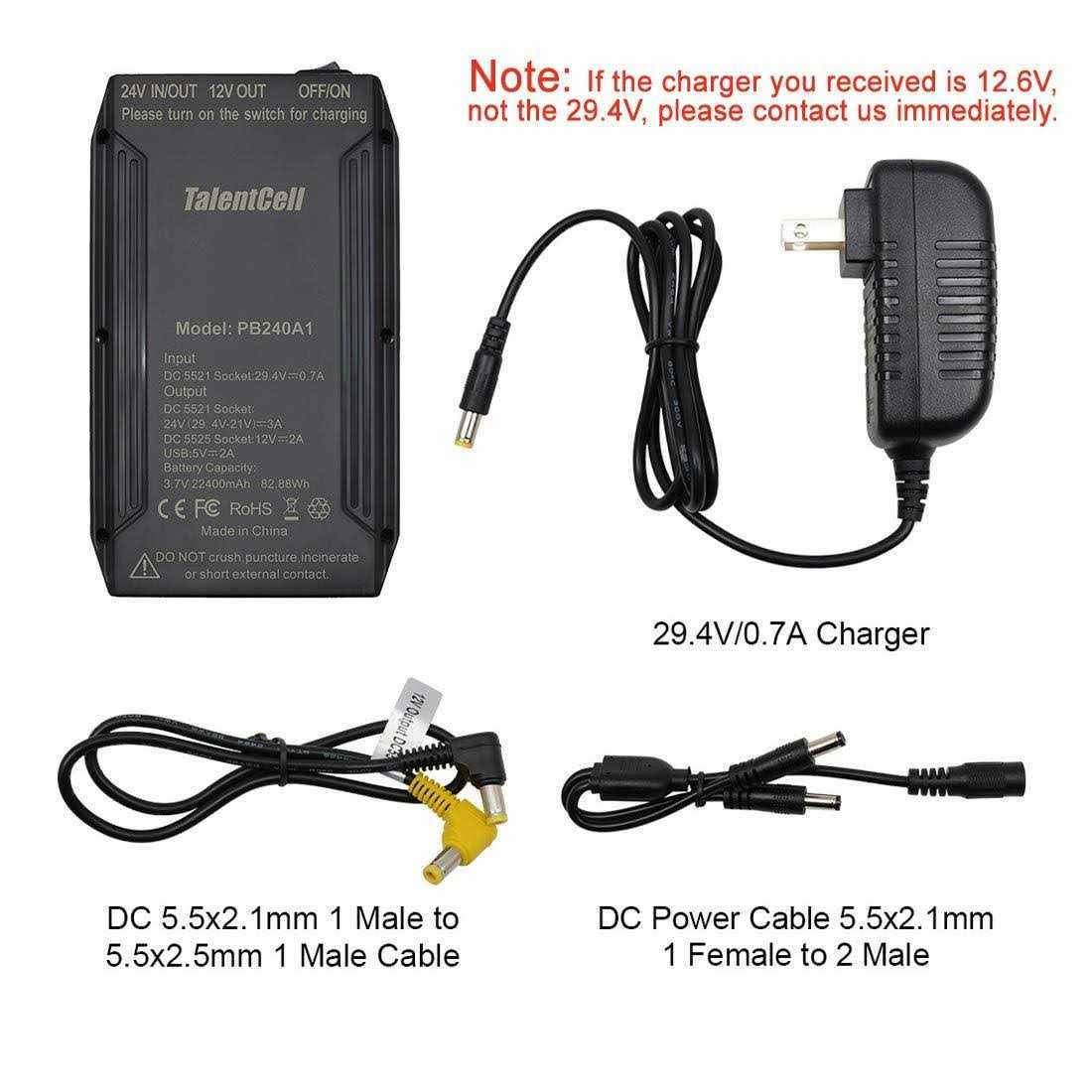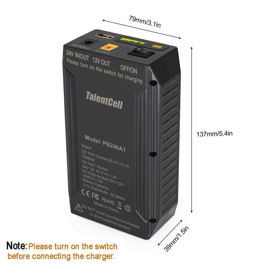 Talentcell 24V Lithium ion Battery PB240A1, Rechargeable 22400mAh 82.88Wh Li-ion Batteries Pack with DC 24V/12v and 5V USB Output for LED Light