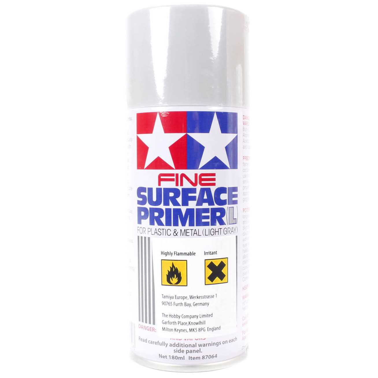 Tamiya Fine Surface Primer L (Light Grey) Spray 180ml – 75-T87064Tamiya Fine Surface Primer is ideal for preparing your plastic model parts made of ABS and Styrene plastic for paint. The primer may also be used for metal parts. The white color primer is great for light color applications; while Tamiya’s gray surface primer is ideal for dark color applications. Both primers bite well into plastic surfaces and even fill in small scratches and imperfections. Each can contains 180ml.The colour patches may vary from the actual colour. Not suitable for children under 14 years. For use under adult supervision.