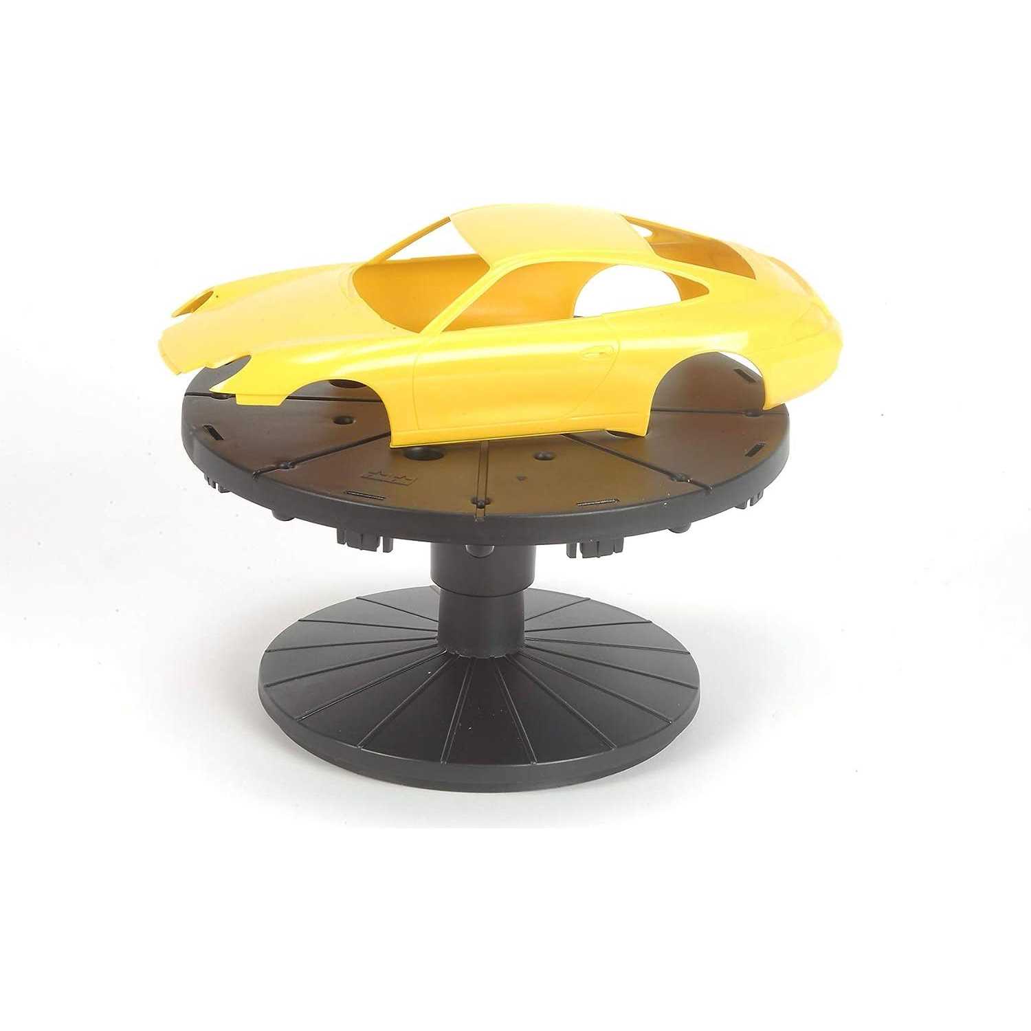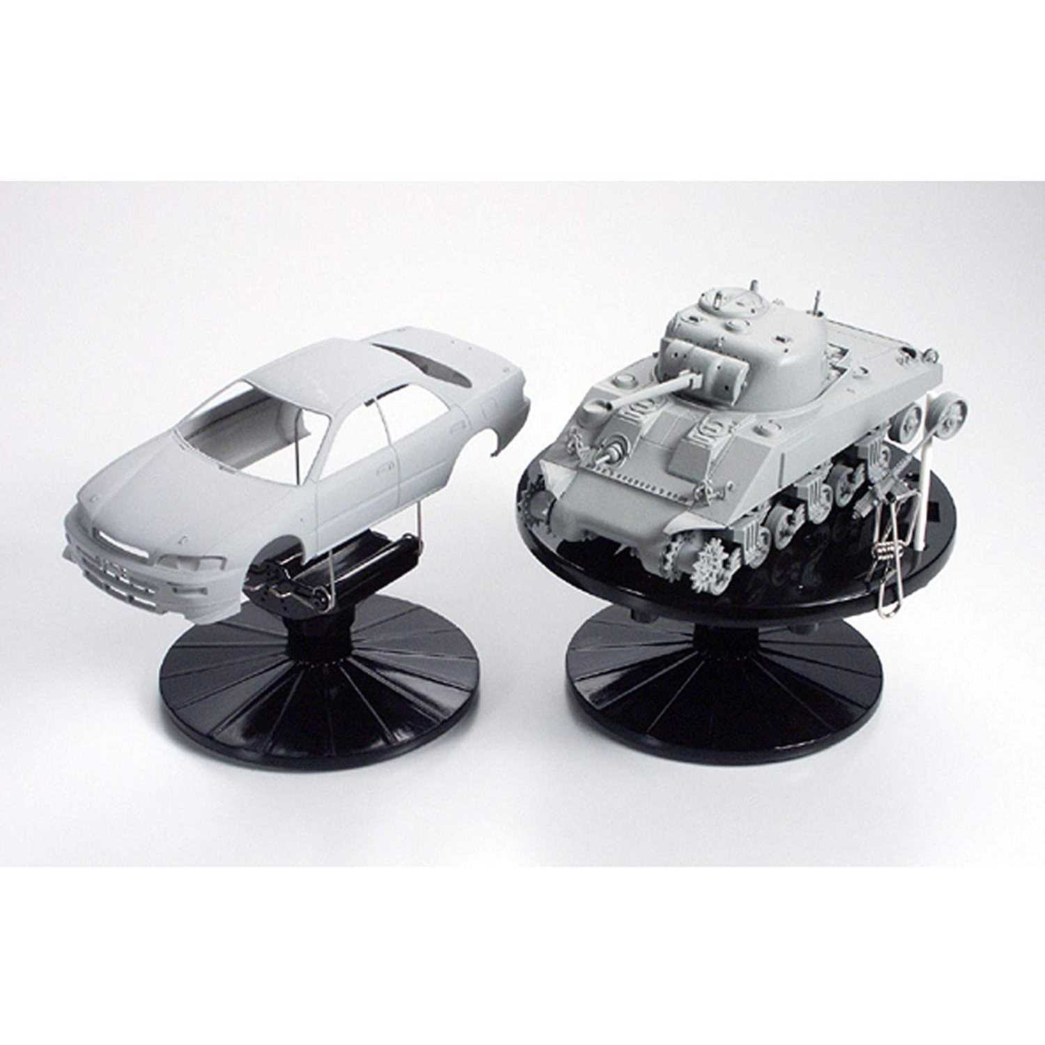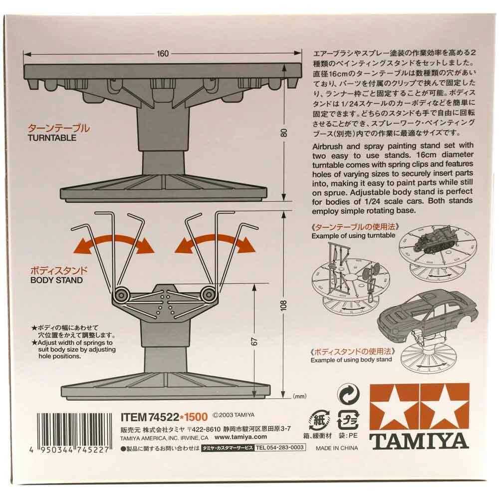 This a multipurpose painting stand set with 2 easy to use stands. Both stands can be adjusted and used for a wide range of sized and shaped pieces. The 16cm diameter turntable has different sized holes to affix various parts to the stand. Parts can be painted easily while still on the sprue or can be affixed to something like a pencil or chopstick inserted into the larger holes. Comes with 4 spring clips. Fixing a model body to the stand from the inside, the body stand is perfect for spray painting 1/24 scale model cars. The width of clips can also be adjusted to obtain the most stable hold.Both body and turntable stands can be used with separately sold painting booths available at model hobby shops and art stores. By using these items, you can make your painting sessions easier by leaving your hands free.