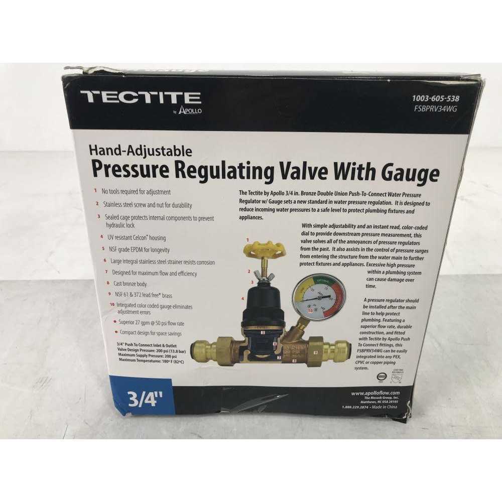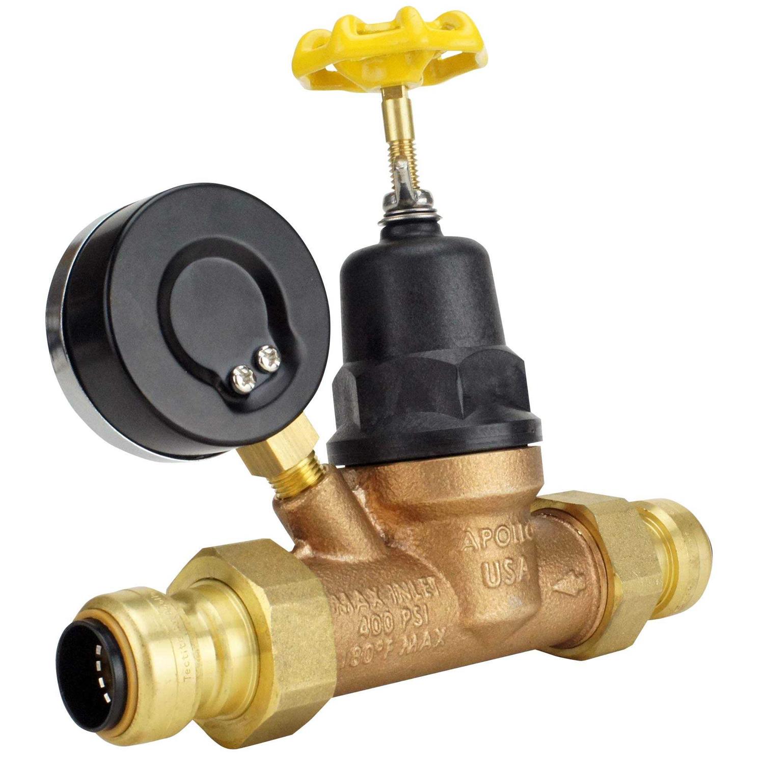 Ball Valves by Apollo Valves. Details:The Apollo 3/4 in. Bronze Double Union Push-To-Connect Water Pressure Regulator w/ Gauge sets a new standard in water pressure regulation. It is designed to reduce incoming water pressures to a safe level to protect plumbing fixtures and appliances. With simple adjustability and an instant read, color-coded dial to provide downstream pressure measurement, this valve solves all of the annoyances of pressure regulators from the past. It also assists in the control of pressure surges from entering the structure from the water main to further protect fixtures and appliances. Excessive high pressure within a plumbing system can cause damage over time. A pressure regulator should be installed after the main line to help protect plumbing. Featuring a superior flow rate, durable bronze construction. Tectite by Apollo pressure gauge offers fast push-to-connect installation in copper, CPVC and PEX piping systems.