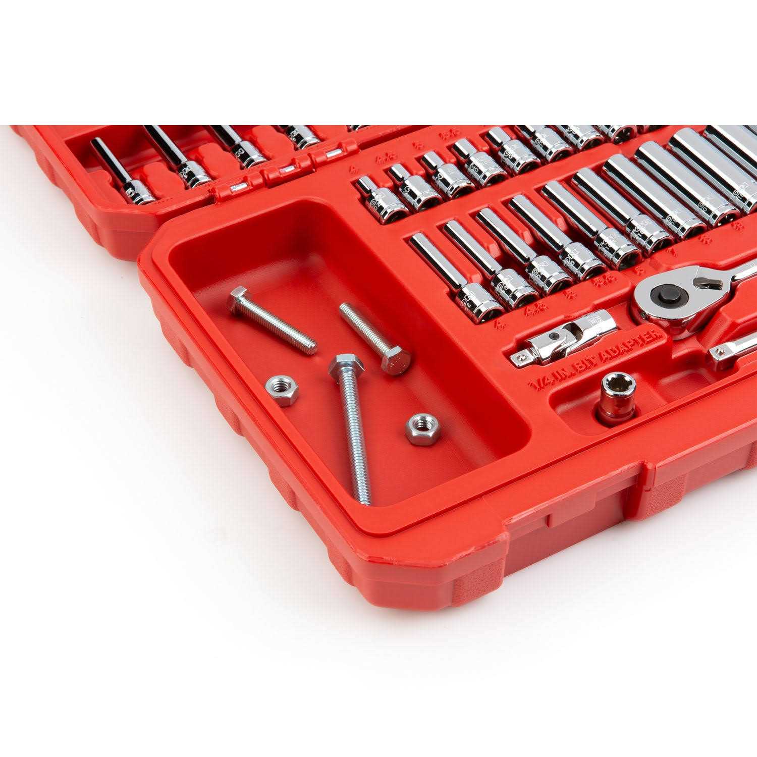 The set comes equipped with a 90-Tooth quick-release ratchet as well as a universal joint, power socket adapter, and extensionwhich arent often found in most sets. All of the tools come stored in a sturdy carrying case. The 6-point socket openings are ideal for working with hex-shaped fasteners and designed to grip the sides and not the corners of the fastener heads, preventing round-off. An extended length allows the deep socket to fit over long fasteners and reach into recessed areas. The large, die-stamped markings are permanently impressed into the material and optimized for readability. A mirror chrome-plated finish protects against corrosion and easily wipes clean.