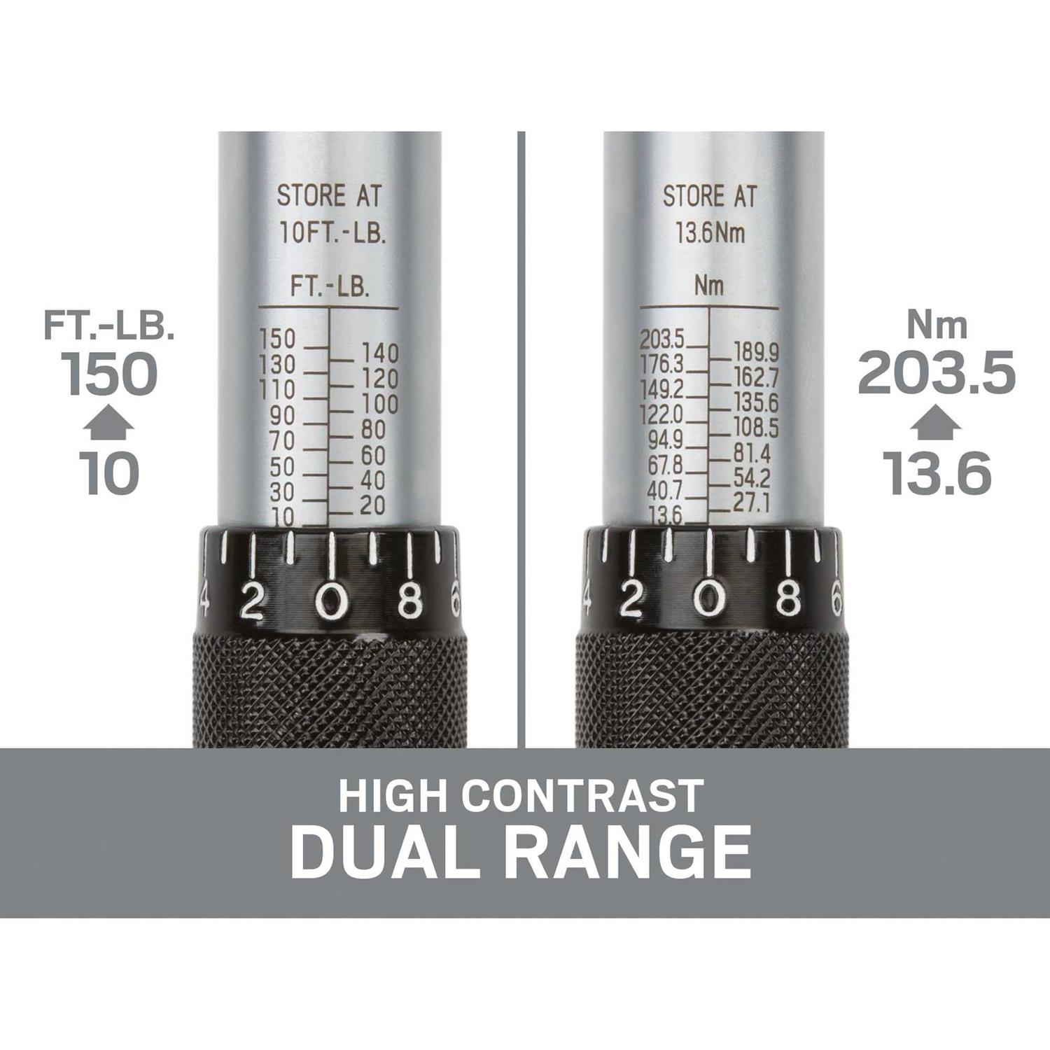 Calibrated to an accuracy of +/- 4%, the TEKTON 1/2 in. Drive Click Torque Wrench lets you work with confidence, eliminating guessing and the common tendency to overtighten fasteners. Correctly tightening fasteners to a vehicle or equipment manufacturer’s torque specifications ensures parts are properly secured without being damaged. Simple and easy to use, this wrench has a reversible ratcheting head that drives fasteners in both directions and measures torque in the clockwise direction. To measure torque, set the desired value on the handle scale (foot pounds or Newton meters) and begin tightening the fastener. When the preset torque value is reached, a reliable mechanical operation inside the handle produces a click you can hear and feel, alerting you to stop applying force. Built for consistent performance and years of dependable service, the mechanical design doesn’t need batteries, and the all-steel construction has no plastic parts to break or wear out. IMPORTANT: This wrench is shipped pre-calibrated and ready to use. To help maintain calibration, store at its lowest setting of 10 ft.-lb. /13.6 Nm when not in use. Be sure to read and understand the operator’s manual, including all safety information, before first use.